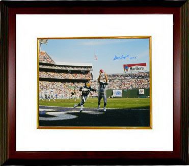 Steve Largent spent thirteen years with the Seahawks, and, while not particularly fast, was extremely sure-handed. He was selected to the NFL Pro Bowl seven times, and was the first Seahawk to earn that honor. When Largent retired, he held all major NFL receiving records, including: most receptions in a career (819), most receiving yards in a career (13,089), and most touchdown receptions (100). He was also in possession of a then-record streak of 177 consecutive regular-season games with a reception. Largent was inducted into the Pro Football Hall of Fame in 1995. Steve Largent has hand autographed this Seattle Seahawks 16x20 Photo with HOF 95 inscription. Schwartz Sports Hologram and Certificate of Authenticity from Athlon Sports. Custom White Mat and Premium Mahogany Color Framed as shown