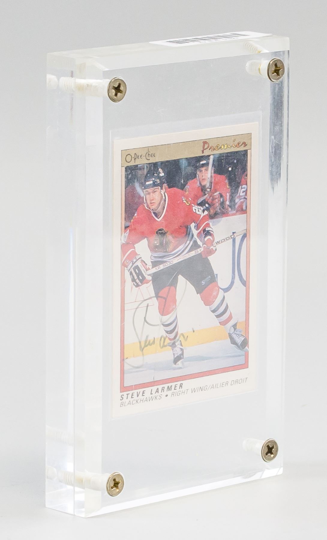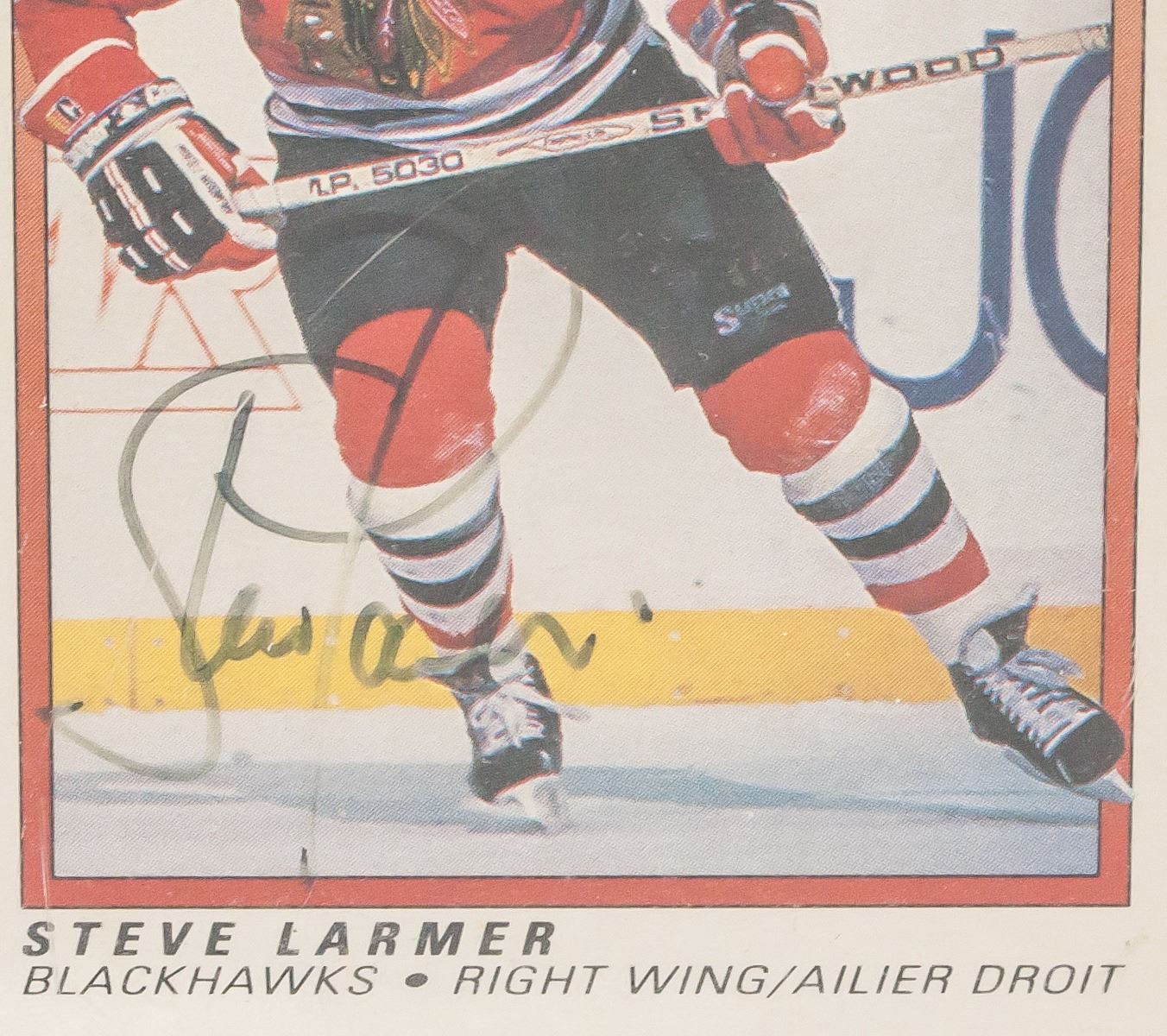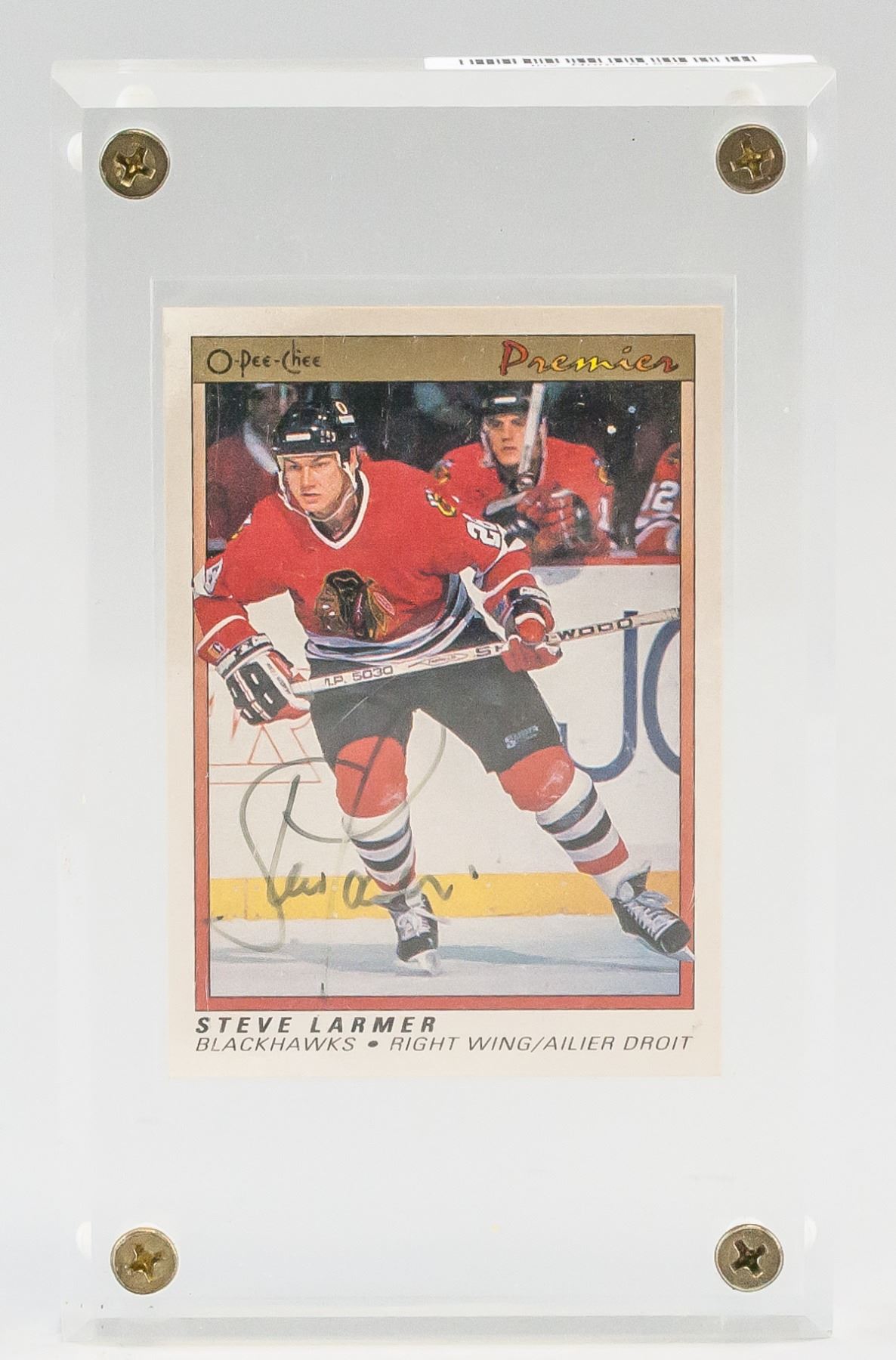 Autographed NHL card signed Steve Larmer (1961- , Canadian). Item measures: 15 x 9 cm, Card size: 9 x 6 cm. Photograph not included. Steve Larmer played in the NHL for the Chicago Blackhawks and New York Rangers and was known as one of the NHL's best power forwards of that era. He won the 1983 Calder Memorial Trophy as well as being named to the NHL All-Rookie Team that year. From 1982 to 1993, Larmer played in 884 consecutive games for the Blackhawks, an NHL record for most consecutive games played with the same team, and the third longest consecutive-games streak in league history. Provenance: Toronto estate