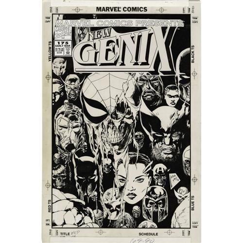 <B>Steve Lightle - Marvel Comics Presents #175 Cover Original Art (Marvel, 1995).</B></I> This creepy cover illustration features New Genix members, Allegra, Blue Shark, Bombardier, and Meridian, amidst the rotting skulls of a host of Marvel heroes and villains, including Spider-Man, Daredevil, Captain America, Nova, Dr. Doom, Magneto, Black Bolt, Black Panther, Iron Man, Hawkeye, and Triton. Illustrated by the series' creator, Steve Lightle, this morbid masterpiece has an image area of 10" x 15", and includes the original logo and masthead paste-up type. In Excellent condition. <BR><BR><B>Important notice:</B> Heritage usually auctions material at the rate of 200-250 lots per hour. On some occasions eBay Live bid software or the Internet may not be able to keep up with the pace of the auction. We recommend placing a realistic absentee bid now as insurance to avoid disappointment. Occasionally the auctioneer may eliminate or reject an eBay Live bid, and the auctioneer may also reopen a lot after the close of the eBay live bidding (usually because we missed an audience bid), and may reject your bid even if it shows you as the winning bidder. By bidding via eBay Live, you agree that Heritage may award the lot to another bidder at its sole discretion under the circumstances described above or any other reasonable circumstances. Since eBay bids are not shown to us until we open the lot on the floor, we treat those bids just like floor bids. In most cases the floor responds before the eBay bid is presented to us, due to Internet lag time, so for consistency we have made it a policy that floor bids are always considered first over tie eBay live bids. Also please note that all Heritage lots purchased through eBay Live carry a 22.5% Buyer's Premium. Please make sure you read the Terms and Conditions before you bid. This lot is being auctioned in conjunction with a live floor auction by Heritage Auction Galleries. All final auction and invoice information will be supplied by Heritage Auction Galleries, and all other information should be considered preliminary. Lot:41001 <BR><BR><B>Winning Notification and Billing:</B> After the FINAL session in this auction is complete, Heritage will send e-mail and snail mail invoices. This process normally takes several days. All final auction and invoice information will be supplied by Heritage Auction Galleries, and all other information should be considered preliminary. <BR><BR>This auction will be conducted on a live auction floor and over the Internet through eBay Live. If you choose to place an absentee bid, please take a moment to <font color='#0000ff'><u><a href='http://pages.ebay.com/liveauctions/help/before/laabsentee.html'>learn how eBay Live absentee bidding works</a></u></font><font color='#000000'>