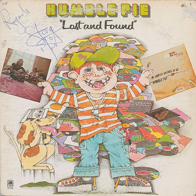 Musician and front man of several notable bands (1947–1991) including Humble Pie and the Small Faces. He died in a fire that swept through his 16th century home. Humble Pie’s Lost and Found album signed on the front cover in blue ballpoint, “Regards, Steve Marriott.” In very good condition, with scattered rubbing and wear to covers, label remnants to top right, scattered edge wear and creases, and mild ‘rings of wear’ to covers. The record is included.