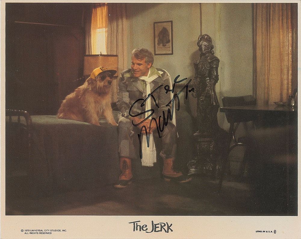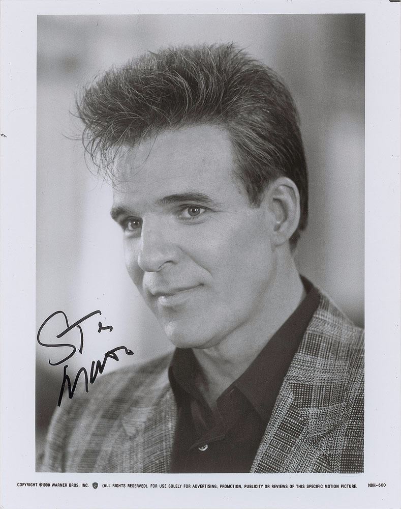 Two items: a glossy 8 x 10 Warner Bros. publicity of Martin as Vinnie Antonelli from the 1990 film My Blue Heaven, signed in black felt tip; and a color Universal Pictures mini lobby card for the 1979 film The Jerk, 10 x 8, signed in black felt tip. In overall fine condition. From the Harvey and Rhoda Kuflik Collection.