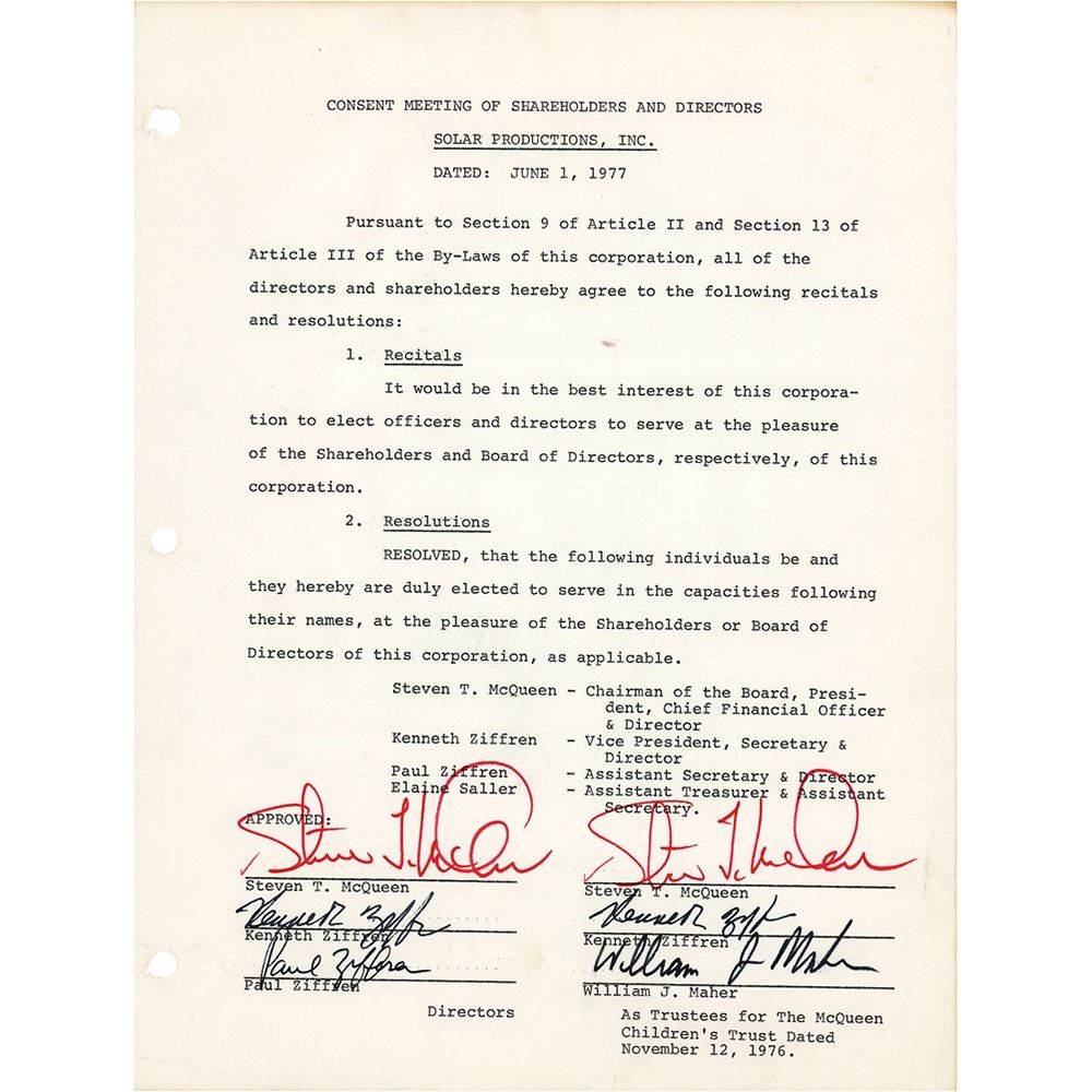 Twice-signed DS, signed “Steven T. McQueen,†one page, 8.5 x 11, June 1, 1977. A document for the "Consent Meeting of Shareholders and Directors" of Solar Productions, Inc., regarding the approval of recitals and their subsequent resolutions, for the election of officers and directors, with McQueen duly elected as "Chairman of the Board, President, Chief Financial Officer & Director." Signed twice at the conclusion in bold red felt tip by McQueen. In fine condition, with light paperclip impressions to the top edge, and three file holes to the left edge.