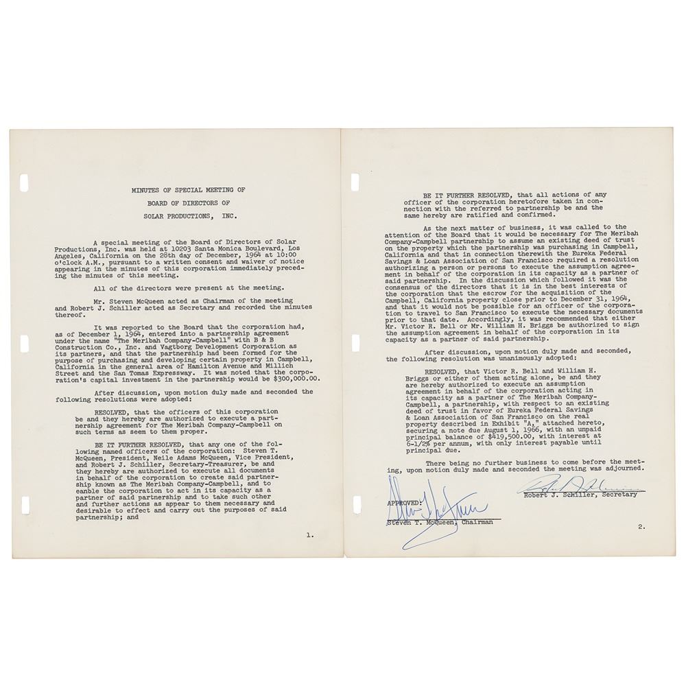 DS, signed “Steven T. McQueen,” two pages, 8.5 x 11, December 28, 1964. Document headed "Minutes of Special Meeting of Board of Directors of Solar Productions, Inc.," relating to partnership agreement under the name 'The Meribah Company-Campbell' "formed for the purpose of purchasing and developing certain property in Campbell, California," and listing a proposed "capital investment in the partnership" of $300,000. Signed at the conclusion in blue ballpoint by McQueen. In very fine condition.