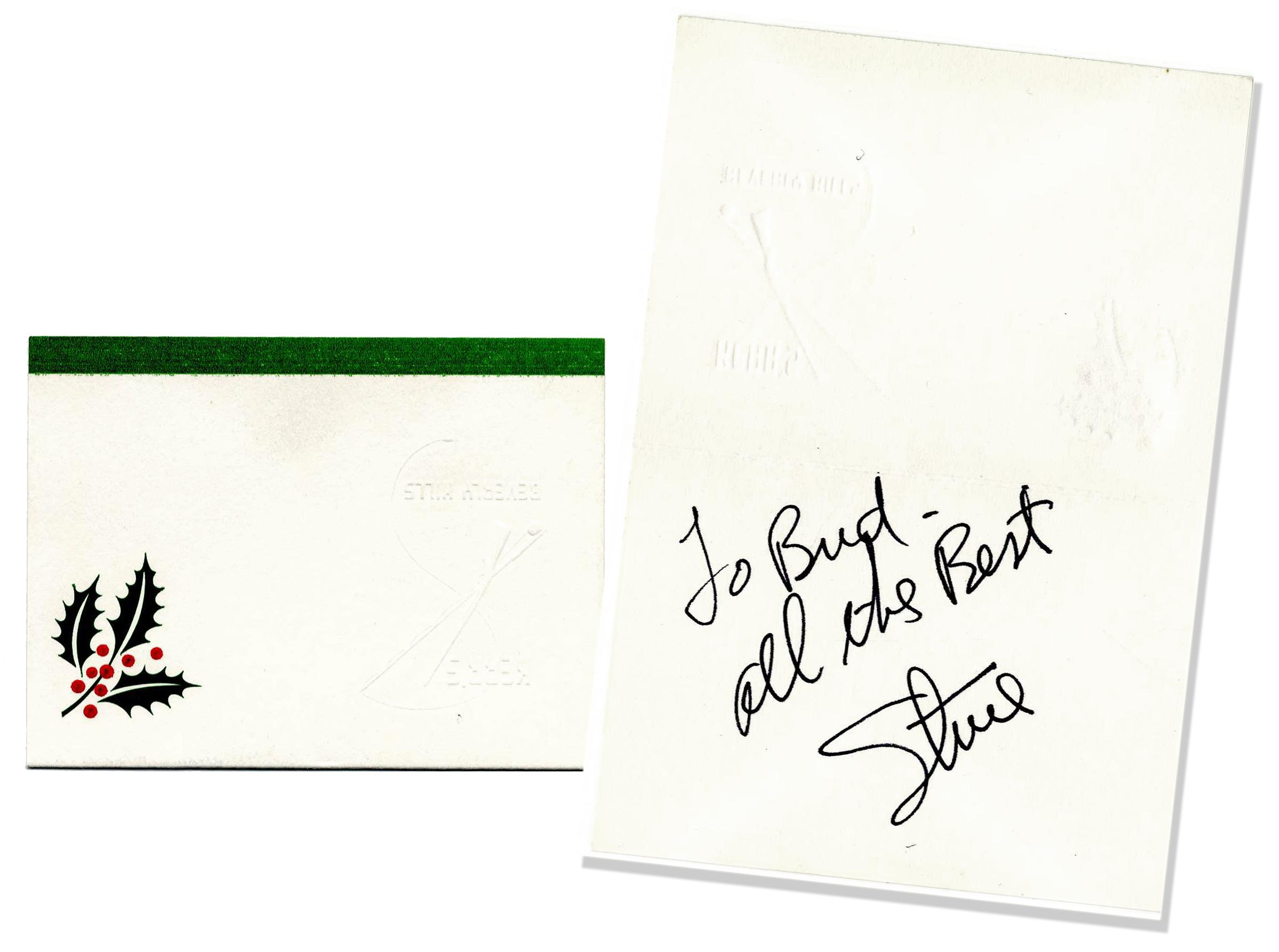 Nice Steve McQueen signed Christmas card on ''Kerr's / Beverly Hills'' holiday gift card stationery. Card reads: ''To Bud -- All The Best, Steve'', with bold, clear signature in black ink. Card measures 3.5'' x 2.5'' folded and 3.5'' x 5'' unfolded. Fine condition.