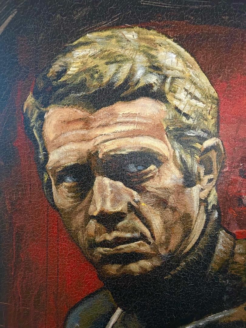 The one & only Steve McQueen by Stephen Holland is a 41.25" x 28" giclee PP1 on stretched canvas, with COA. Finish is crackled throughout but shows great.