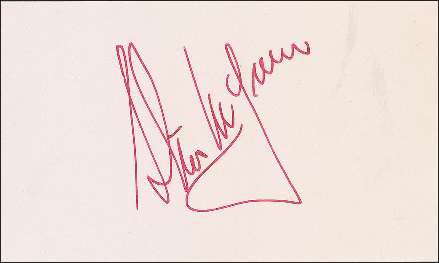 Fantastic red felt tip in-person signature, “Steve McQueen,” on an off-white 5 x 3 card. In very fine condition.