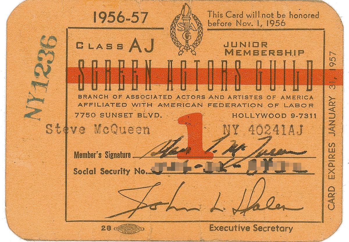 McQueen’s Screen Actors Guild Junior Membership card for 1956-57, 3.5 x 25, issued from the Hollywood branch on Sunset Boulevard. McQueen’s name and number are typed on the card, which is then signed in black ink, “Steve T. McQueen,” who then adds his Social Security number under his signature. Card also bears a printed signature of the Guild’s executive secretary. In fine condition, with several mild creases, stamp to blank left edge, a bit of mild soiling, and pencil notation on reverse.