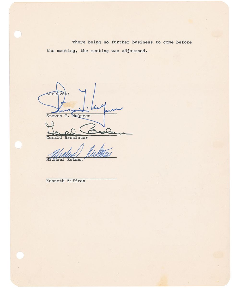 DS, signed “Steven T. McQueen,” one page, 8.5 x 11, no date. Evidently the last page of the minutes of a meeting, which reads, in full: “There being no further business to come before the meeting, the meeting was adjourned.” The document bears McQueen’s large, bold signature, “Steven T. McQueen,” as well as the signatures of two others, Gerald Breslaur and Michael Rutman. In very good condition, with small area of tan discoloration above the first name of McQueen’s signature, three punch holes to left margin, and scattered small areas of trivial soiling, and light creasing.