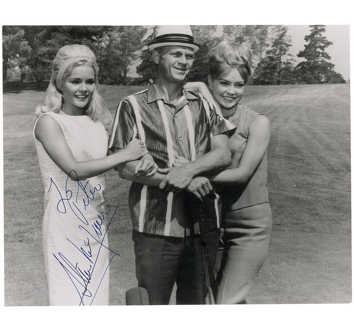 One of the most revered actors of his generation, he is remembered for his wild antics and lifestyle and is best remembered for his roles in Papillon, Bullitt, The Thomas Crown Affair, The Sand Pebbles, The Cincinnati Kid, The Great Escape, and The Magnificent Seven. Vintage glossy 10 x 8 double weight photo of McQueen arm-in-arm with two lovely women, one of them his Soldier in the Rain co-star Tuesday Weld, signed and inscribed in-person in fountain pen “To Peter, Steve McQueen.” In fine condition, with some scattered light rubbing to finish and a small crease to lower right. An exceptional early in-person example from a Hollywood legend quite elusive in signed photos.