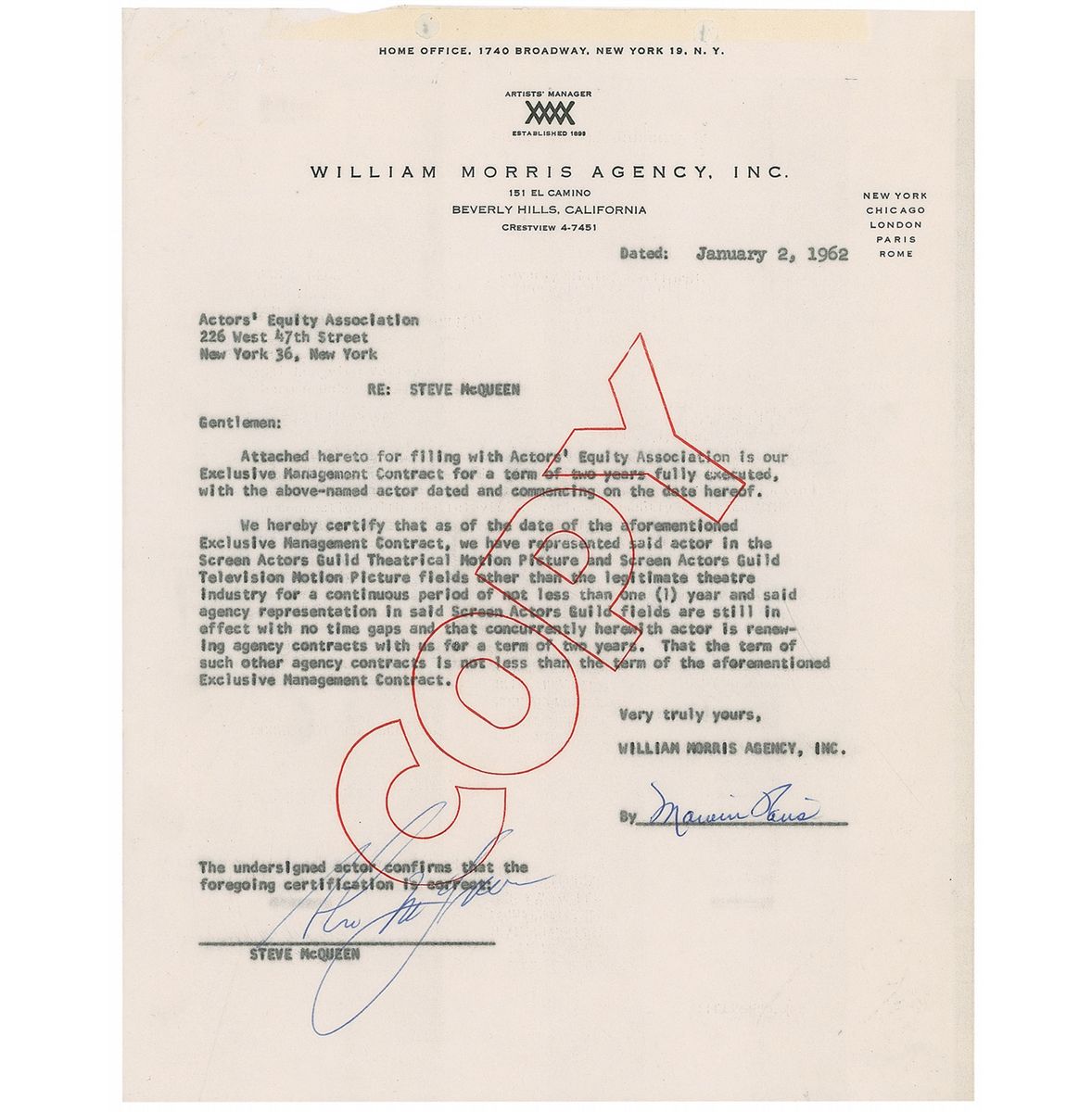 Scarce DS, one page, 8.5 x 10.75, January 2, 1962. Retained carbon document submitted to the Actors’ Equity Association in which McQueen certifies that the William Morris Agency has represented him continuously “in the Screen Actors Guild Theatrical Motion Picture and Screen Actors Guild Television Motion Picture fields” for over one year. Filing and staple holes to the top, and show-through from a mounting strip to reverse, otherwise fine condition. McQueen’s top project during 1962 was The Great Escape, which began filming in June. The film’s wild success following its release in 1963 solidified McQueen’s status as a superstar and definitively marked his transition from television to the silver screen. A superlative piece from the sought-after Hollywood hero.