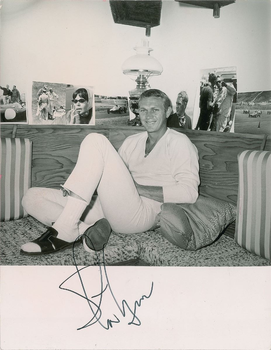 Fantastic glossy 7.25 x 9.25 full-length photo of McQueen relaxing in a corner, the walls behind him lined with personal photos, with subjects including his wife Neile Adams and various memorable moments at the racetrack and movie set, signed in the lower border in black felt tip by McQueen. In fine condition, with scattered light creasing.