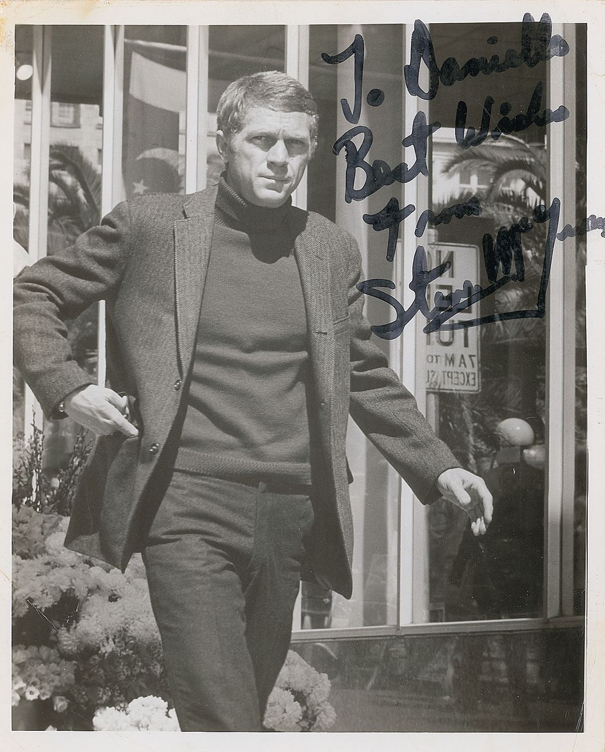 Desirable glossy 8 x 10 photo of McQueen in his memorable role as Frank Bullitt, signed and inscribed in thick black felt tip, “To Danielle, Best Wishes, from Steve McQueen.” In very good to fine condition, with overall surface creases, and slight toning confined to upper left corner. Accompanied by a full letter of authenticity from PSA/DNA.