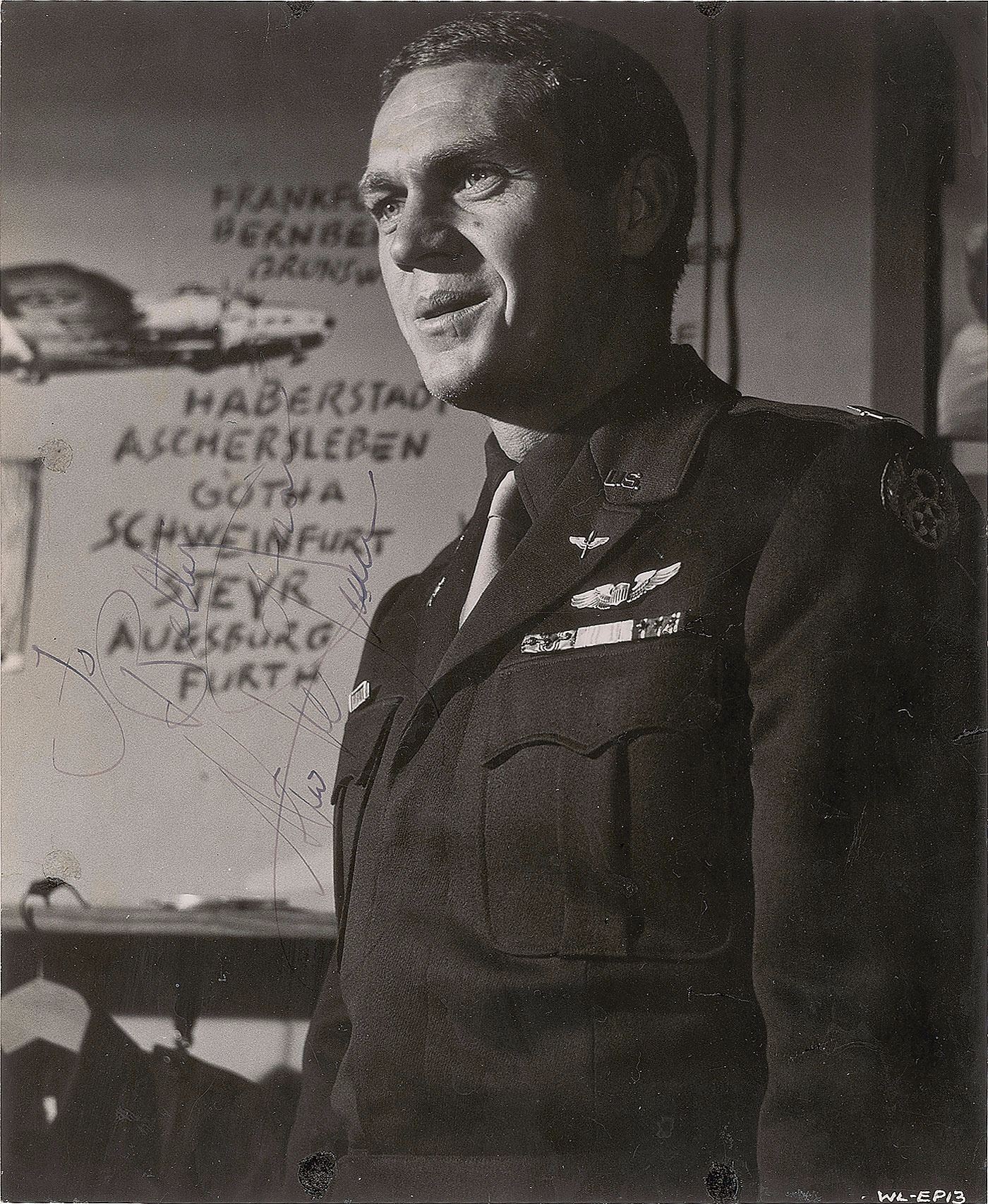 Vintage glossy 7.5 x 9.25 half-length photo of McQueen as Buzz Rickson from the 1962 film The War Lover, signed and inscribed in fountain pen, “To Betty, from Steve McQueen.” In very good condition, with trimmed edges, scattered creasing and surface gouging, and professional repairs to several former punch holes at the edges. A handsome image of the sought-after leading man.