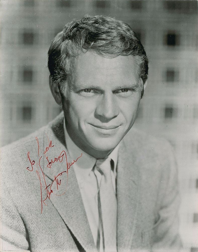 Extremely desirable vintage glossy 7.25 x 9.5 studio portrait of McQueen wearing a sports coat and tie, signed and inscribed in fountain pen, "To Jack, from, Steve McQueen.” Reverse bears a Paramount Film Service property stamp. In very good to fine condition, with trimmed edges, scattered light creasing, and impressions along the top edge from a typed notation on the reverse.
