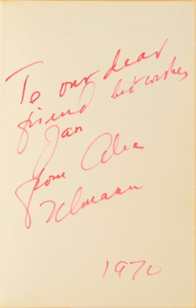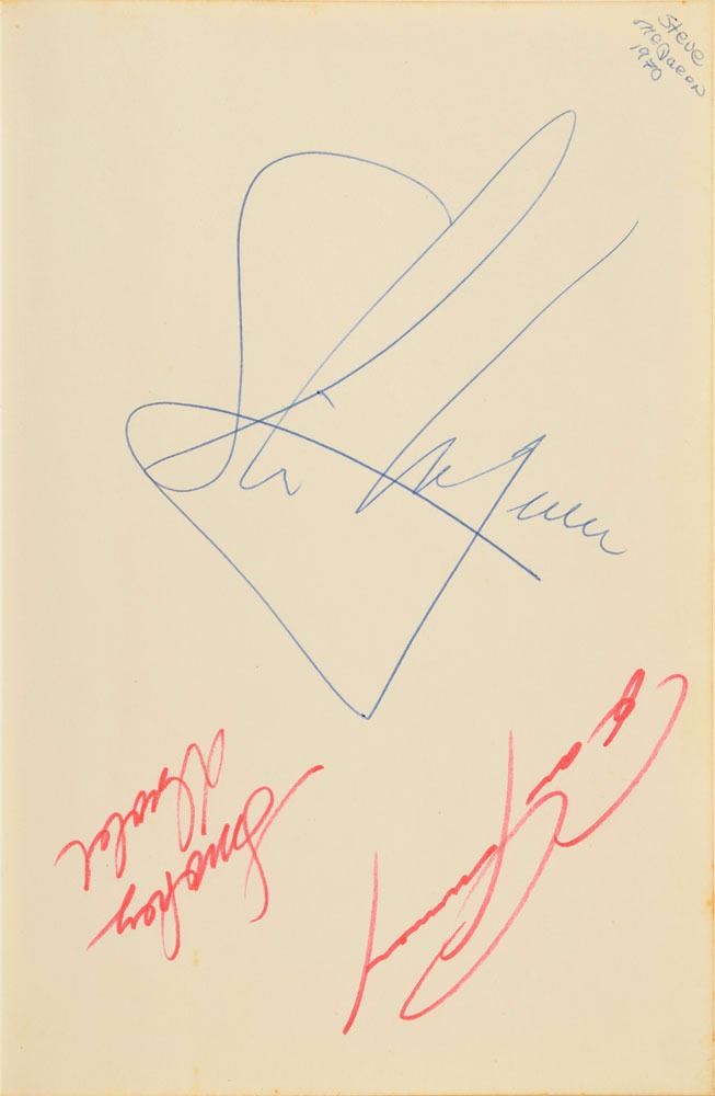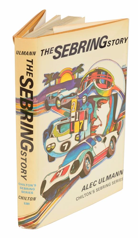 Signed book: The Sebring Story. First edition. Philadelphia: Chilton Book Company, 1969. Hardcover with dust jacket, 5.75 x 8.25, 203 pages. Signed upside down on the rear endpaper in blue ballpoint by Steve McQueen, and in red felt tip by two others. Also signed and inscribed on the first free end page by the author, Alec Ulmann, and throughout the book by grand prix racer Giovanni Lurani, race secretary Reggie Smith, Bob Grossman, and Monty Thomas. A small collector's notation near McQueen's signature dates it to 1970. In fine condition. Accompanied by a full letter of authenticity from PSA/DNA. McQueen raced his Porsche 908 in the 1970 running of the famous '12 Hours of Sebring' race, finishing in second place. A desirable volume connecting McQueen and motorsports.