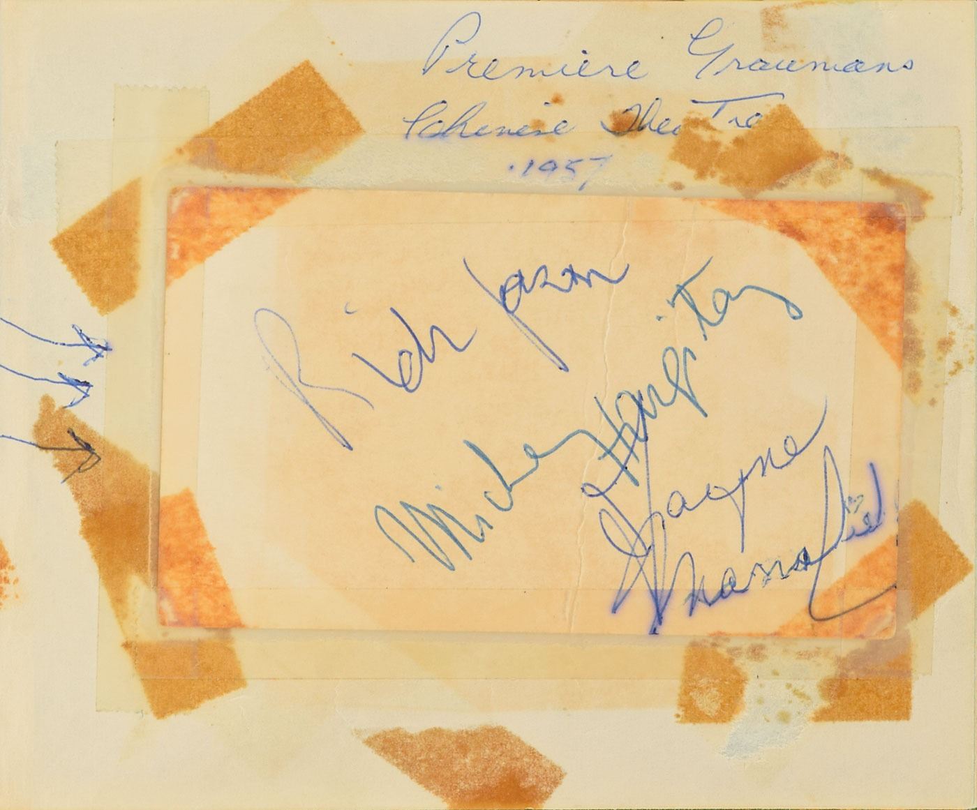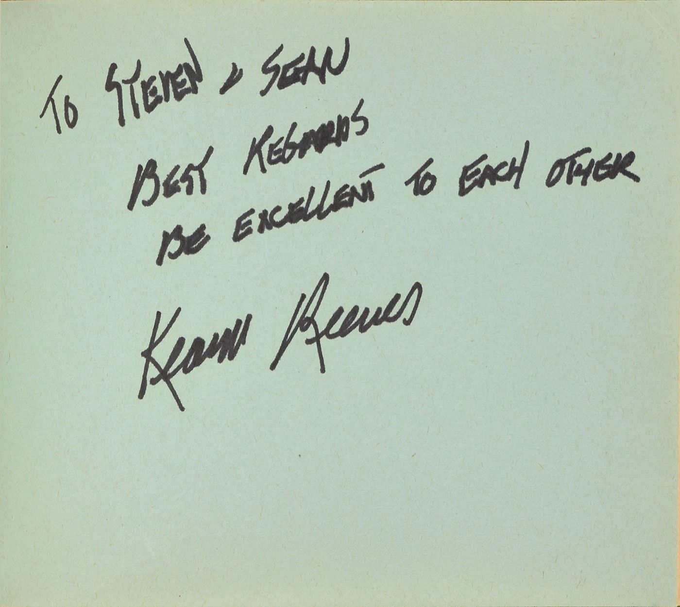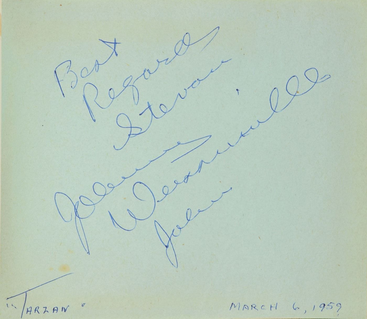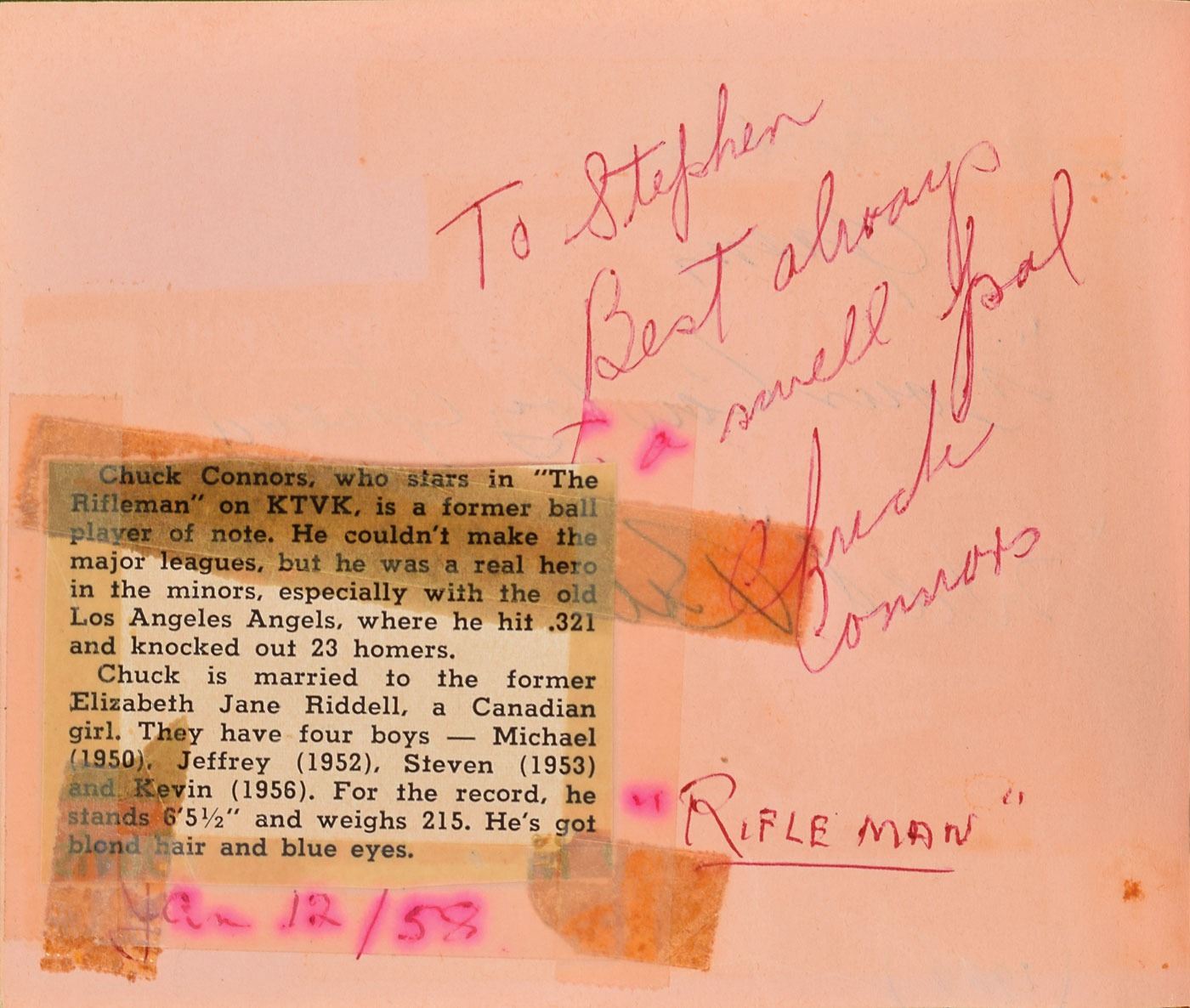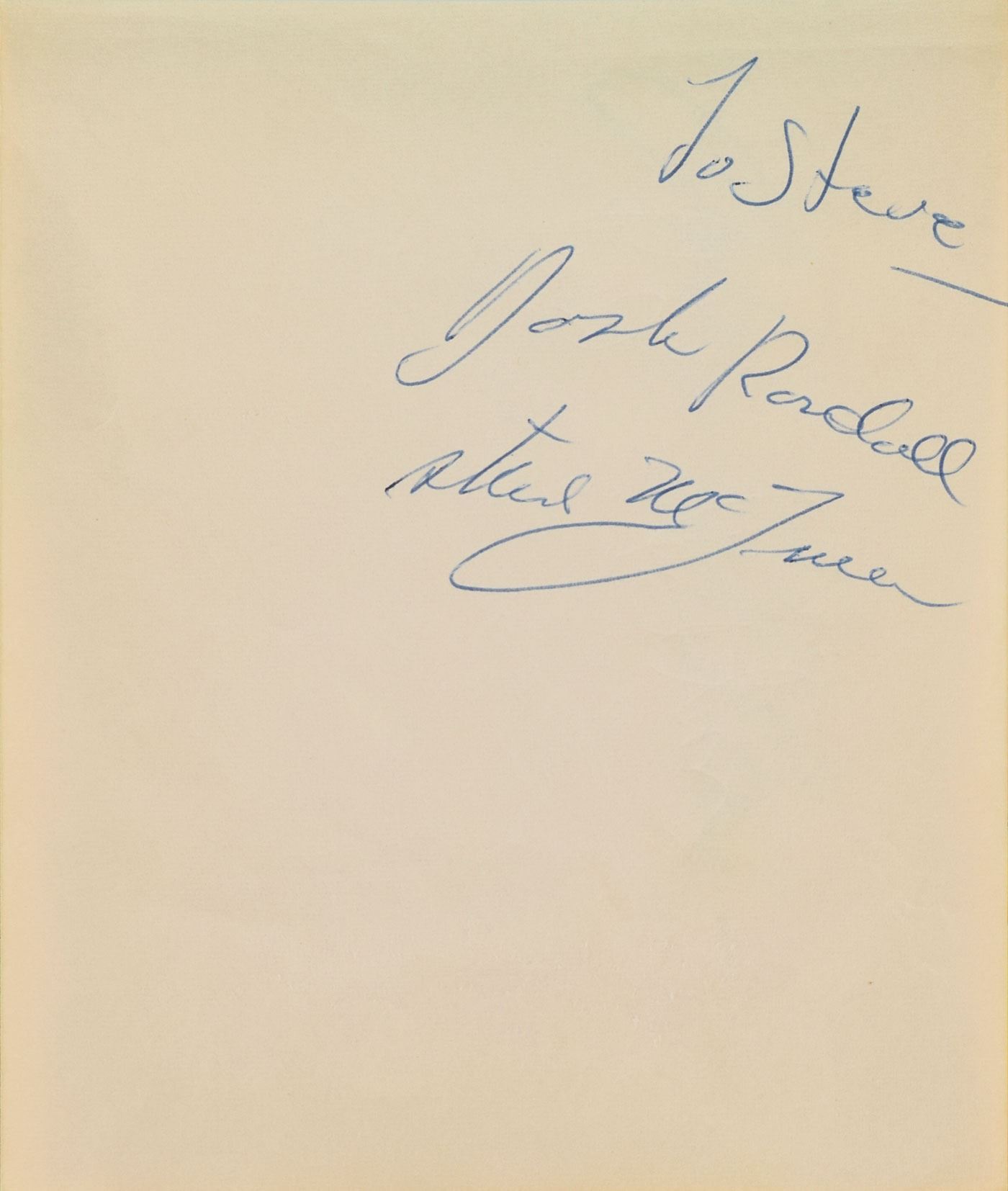 Vintage ballpoint signature and inscription, "To Steve—Josh Randall, Steve McQueen,” on an off-white page still contained within its original 6 x 4.75 autograph album. Among the other signers in the album are Jayne Mansfield and Mickey Hargitay, Red Skelton, Danny Thomas, Jeff Chandler, Keye Luke, Gale Storm, John Ashley, Chuck Connors, Tony Dow, Johnny Weissmuller, Irish McCalla, and Keanu Reeves (signed much later). In overall very good to fine condition, with tape repairs to the autograph book's spine and toning to various other signatures; McQueen is in very fine condition. McQueen played the role of bounty hunter Josh Randall on the Western TV series Wanted: Dead or Alive, which aired from 1958 to 1961. A desirable and uncommon example of the action star's autograph.