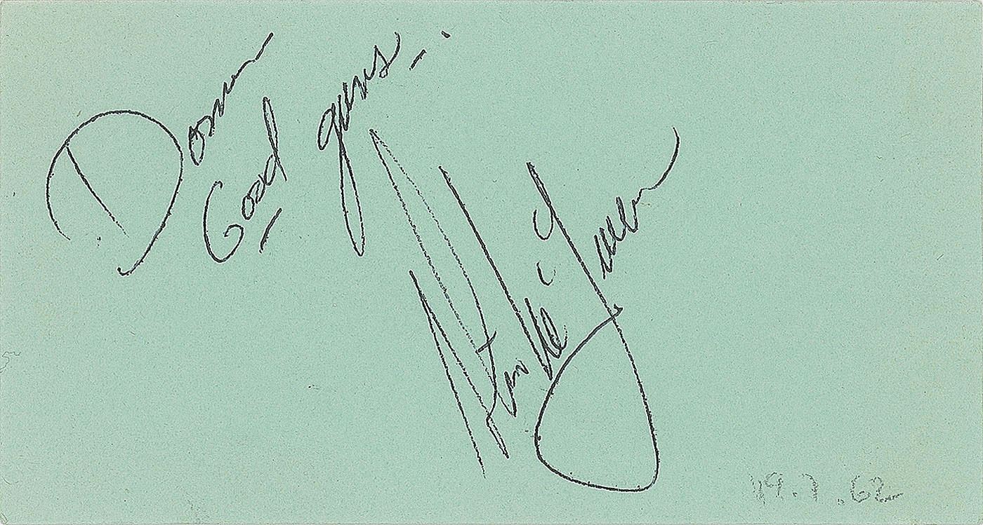 Vintage ballpoint signature and inscription, "Donn—Good guns, Steve McQueen,” on the reverse of a light green 4.75 x 2.5 card for a German gun shop, bearing a 1962 collector's date notation. In fine condition.
