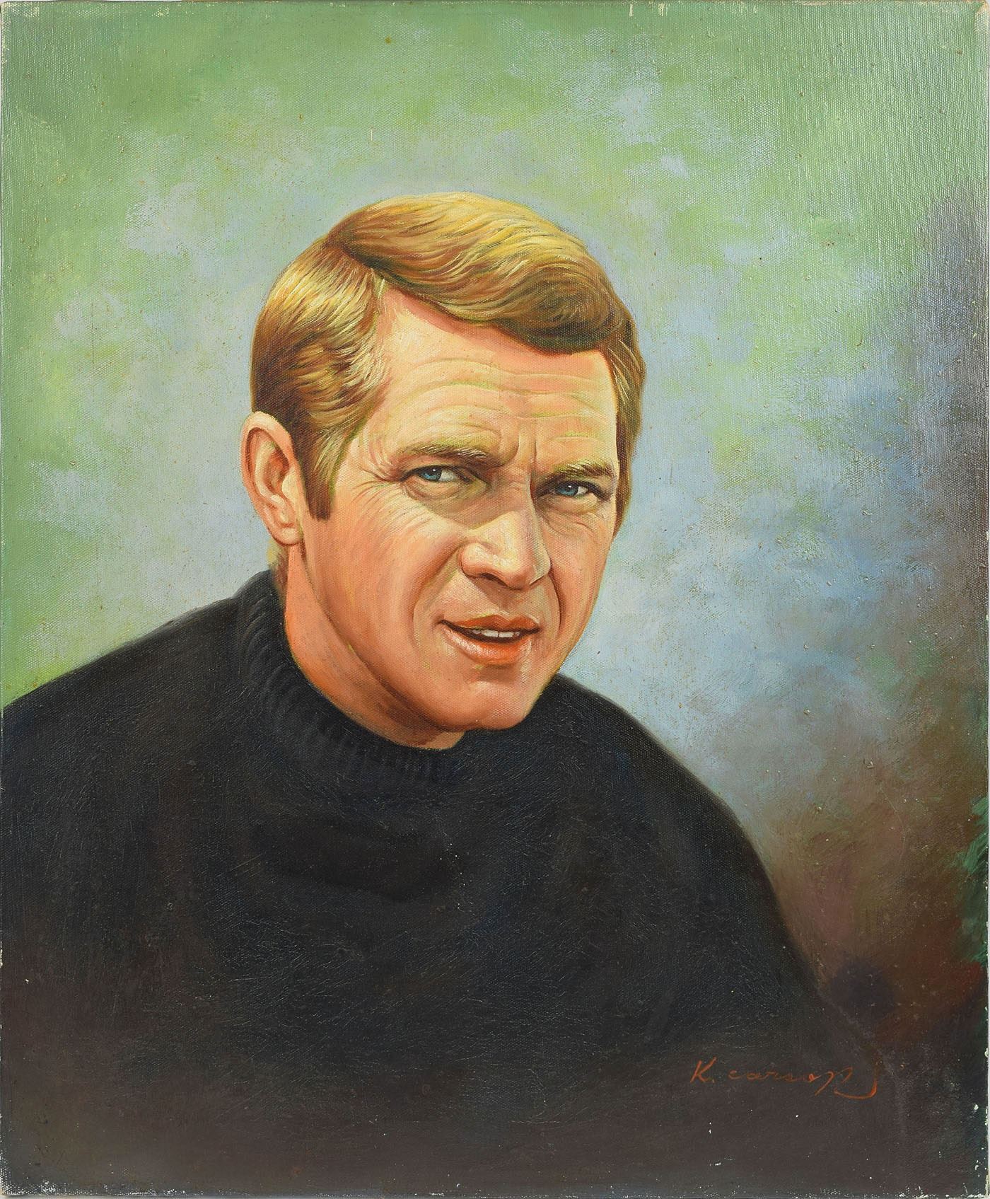 Stunning painting of legendary Hollywood action hero Steve McQueen, oil on stretched canvas, 20 x 24, signed in the lower right in red paint by the artist, "K. Carson." The circa 1970s portrait aptly captures McQueen's cool visage. In fine condition.