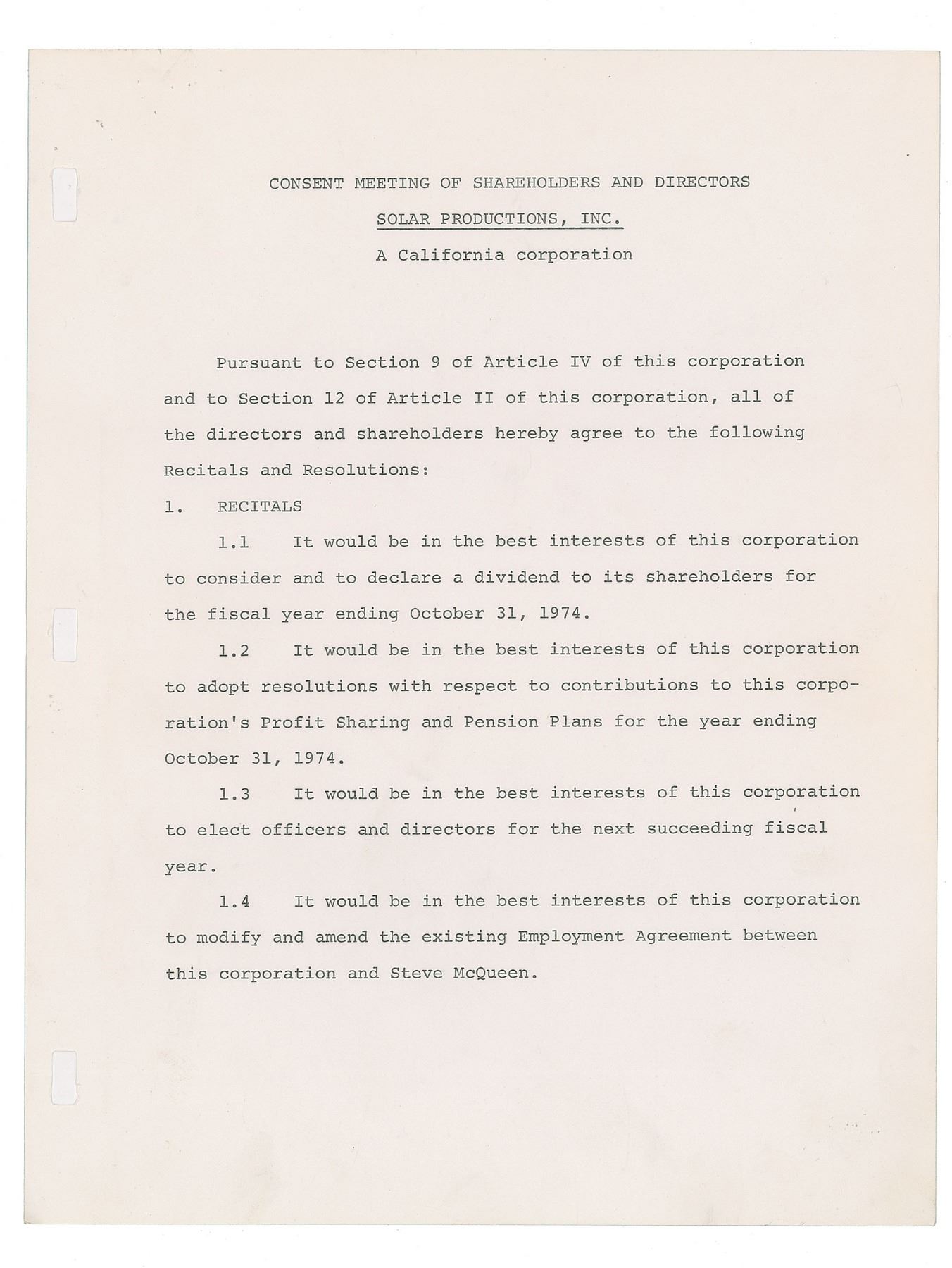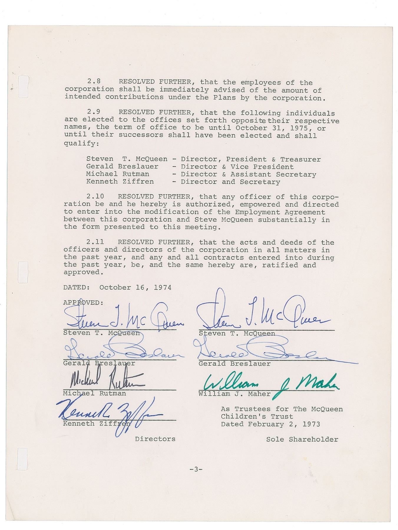 DS, signed twice “Steven T. McQueen,” three pages, 8.5 x 11, October 16, 1974. Document regarding a "Consent Meeting of Shareholders and Directors" of the Solar Plastics Engineering Company, which features a list of agreed upon recitals and resolutions, with resolution 2.9 affirming that "Steven T. McQueen" is elected as "Director, President & Treasurer" until October 31, 1975. Signed twice at the conclusion in blue ink by McQueen. In fine condition.
