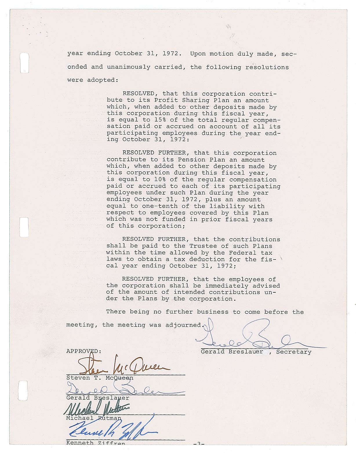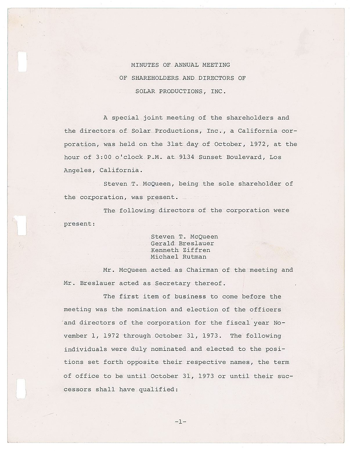 DS, signed “Steven McQueen,” three pages, 8.5 x 11, October 31, 1972. Document regarding "Minutes of Annual Meeting of Shareholders and Directors of Solar Productions, Inc," in which "Steven T. McQueen" was nominated and elected as the "Director, President & Treasurer" for the following fiscal year. Signed at the conclusion in brown felt tip by McQueen, and countersigned by the other elected officials. In fine condition. In 1972, McQueen starred in back-to-back films by director Sam Peckinpah—the western Junior Bonner and the action film The Getaway, which paired him opposite his future second wife, Ali MacGraw.