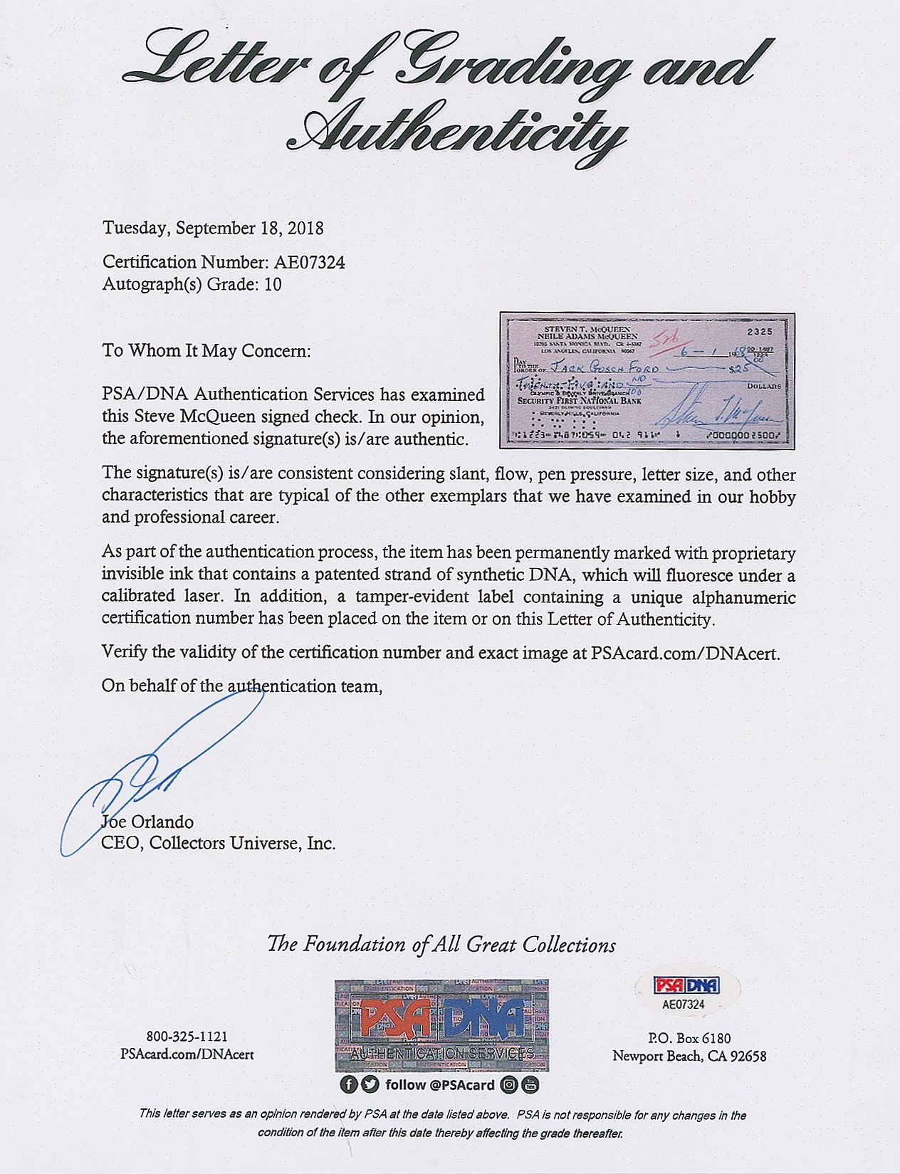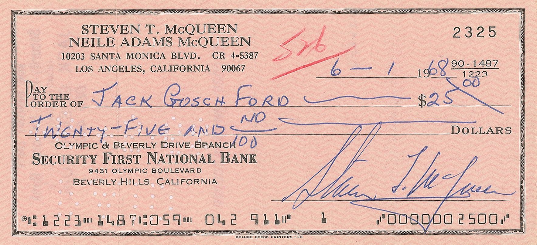 Personal check, 6 x 2.75, filled out in another hand and signed by McQueen, "Steven T. McQueen," payable to Jack Gosch Ford for $25, June 1, 1968. In fine condition. Accompanied by a full letter of authenticity from PSA/DNA.