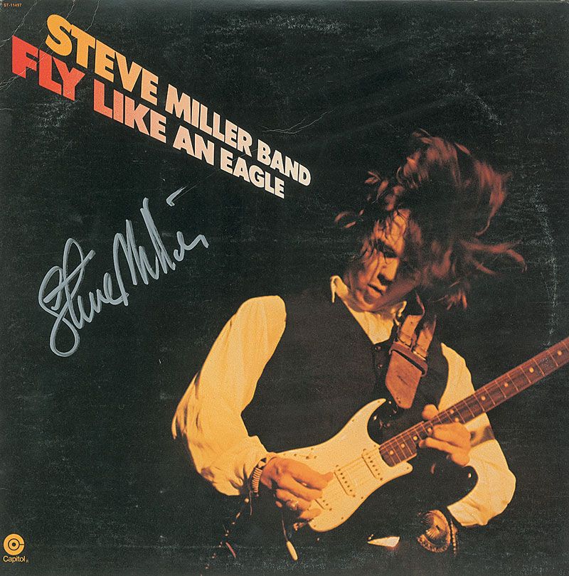 Fly Like an Eagle album signed on the front cover in silver ink. In fine condition, with a few corner creases and a light ‘ring of wear’ to front cover. The record is included.