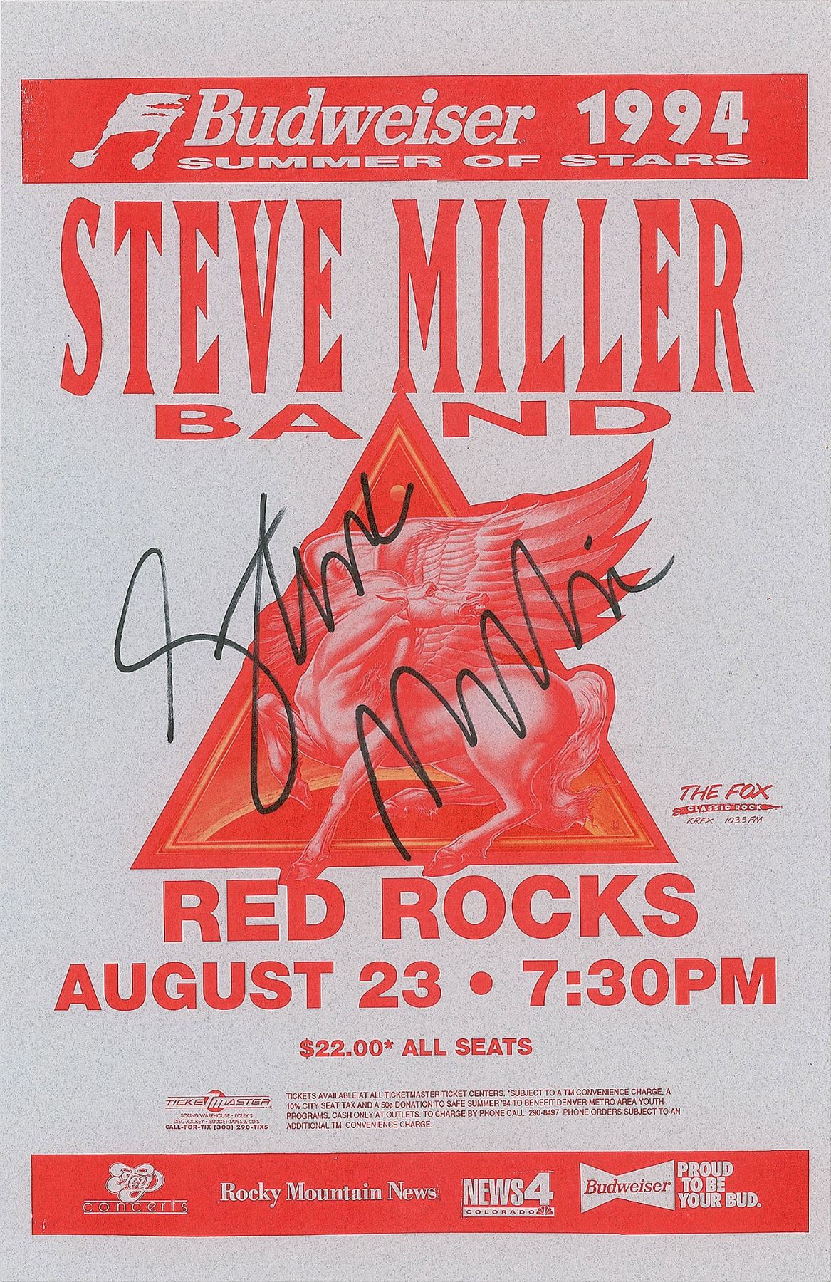 Original red-and-white 11 x 17 first printing poster for a Steve Miller Band concert at Colorado's Red Rocks Amphitheatre on August 23, 1994, prominently signed in black felt tip. In fine condition.