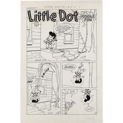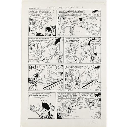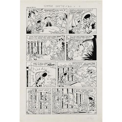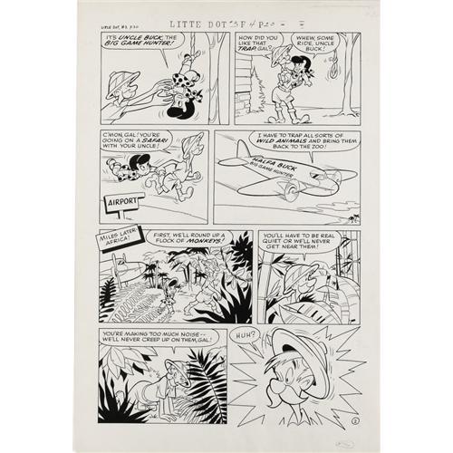 <B>Steve Muffatti - Little Dot #3 Complete 5-page Story "Jungle Fun" Original Art (Harvey, 1954).</B></I> Little Dot goes big game hunting with her Uncle Buck in this delightful five-pager. Superb Steve Muffatti art is a highlight. The image area of each page is 12" x 18", and the art is in Excellent condition. <BR><BR><B>Important notice:</B> Heritage usually auctions material at the rate of 200-250 lots per hour. On some occasions eBay Live bid software or the Internet may not be able to keep up with the pace of the auction. We recommend placing a realistic absentee bid now as insurance to avoid disappointment. Occasionally the auctioneer may eliminate or reject an eBay Live bid, and the auctioneer may also reopen a lot after the close of the eBay live bidding (usually because we missed an audience bid), and may reject your bid even if it shows you as the winning bidder. By bidding via eBay Live, you agree that Heritage may award the lot to another bidder at its sole discretion under the circumstances described above or any other reasonable circumstances. Since eBay bids are not shown to us until we open the lot on the floor, we treat those bids just like floor bids. In most cases the floor responds before the eBay bid is presented to us, due to Internet lag time, so for consistency we have made it a policy that floor bids are always considered first over tie eBay live bids. Also please note that all Heritage lots purchased through eBay Live carry a 22.5% Buyer's Premium. Please make sure you read the Terms and Conditions before you bid. This lot is being auctioned in conjunction with a live floor auction by Heritage Auction Galleries. All final auction and invoice information will be supplied by Heritage Auction Galleries, and all other information should be considered preliminary. Lot:41001 <BR><BR><B>Winning Notification and Billing:</B> After the FINAL session in this auction is complete, Heritage will send e-mail and snail mail invoices. This process normally takes several days. All final auction and invoice information will be supplied by Heritage Auction Galleries, and all other information should be considered preliminary. <BR><BR>This auction will be conducted on a live auction floor and over the Internet through eBay Live. If you choose to place an absentee bid, please take a moment to <font color='#0000ff'><u><a href='http://pages.ebay.com/liveauctions/help/before/laabsentee.html'>learn how eBay Live absentee bidding works</a></u></font><font color='#000000'>