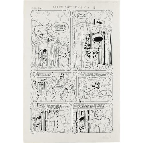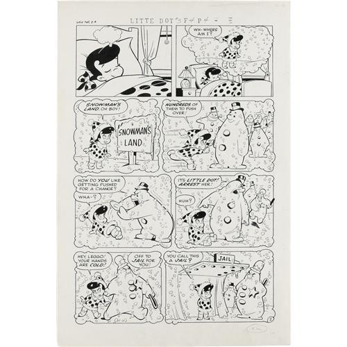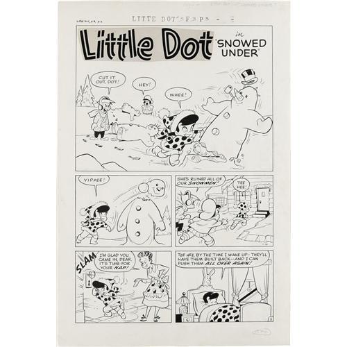 <B>Steve Muffatti - Little Dot #8 Complete 5-page Little Dot Story "Snowed Under" Original Art (Harvey, 1954).</B></I> Little Dot's habit of knocking over snowmen is soon changed after a bad dream shows her the error of her ways! Crisp Steve Muffatti art is the highlight of this lot. The image area of each page is 12" x 18", and the art is in Excellent condition.