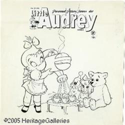 <B>Steve Muffatti (attributed) - Little Audrey #29 Cover Original Art (Harvey, 1953).</B></I> Making an early appearance at Harvey Comics (after a 4-year run at St. John), Little Audrey hosts a tea party in the most efficient way possible. Steve Muffatti provides a delicate and delightful image of the Playful One, with a to-the-point composition, and crisp ink lines. Historic and stunning, this fifth Harvey cover is a keeper. The artwork measures 13.25" x 13.5", and is in Excellent condition with moderate overall aging. The logo is a recent replacement.