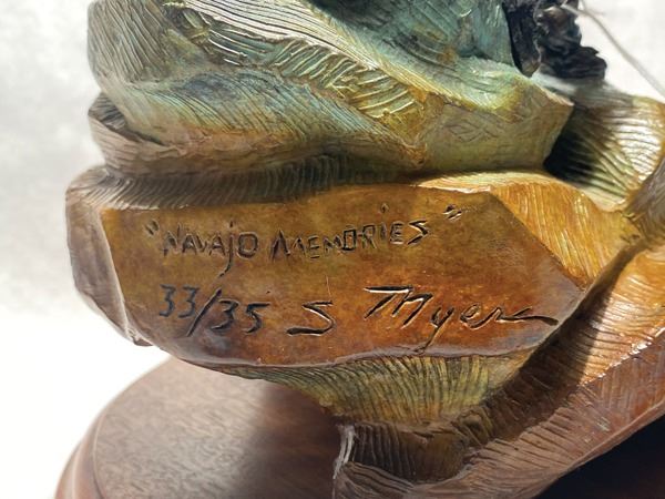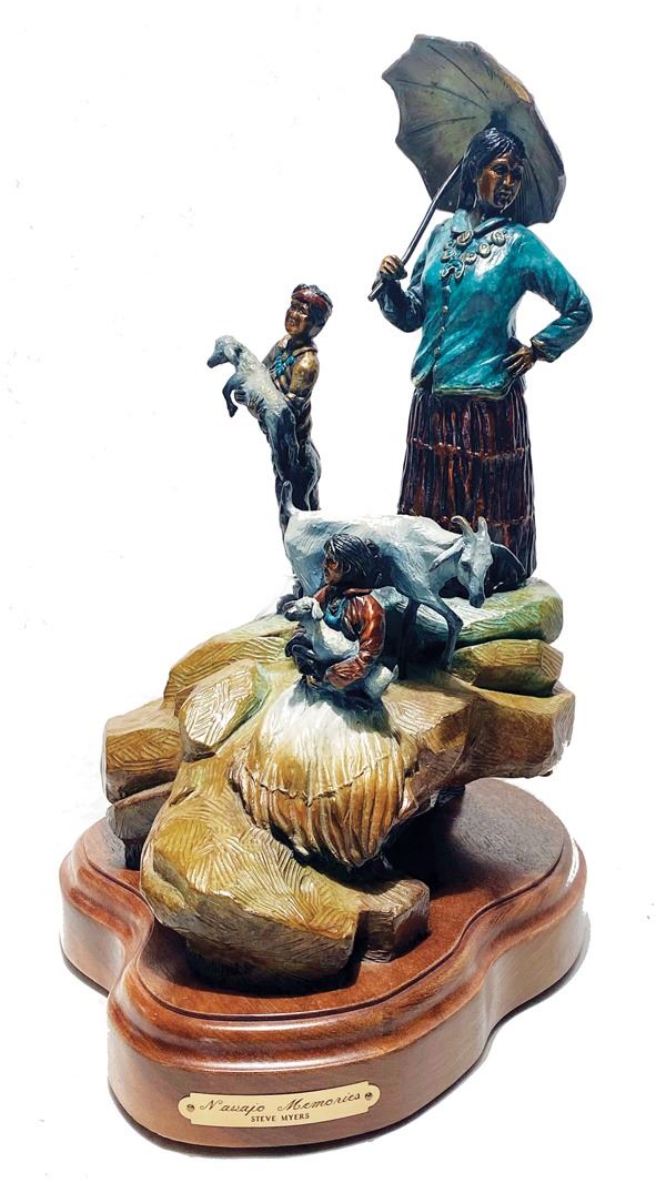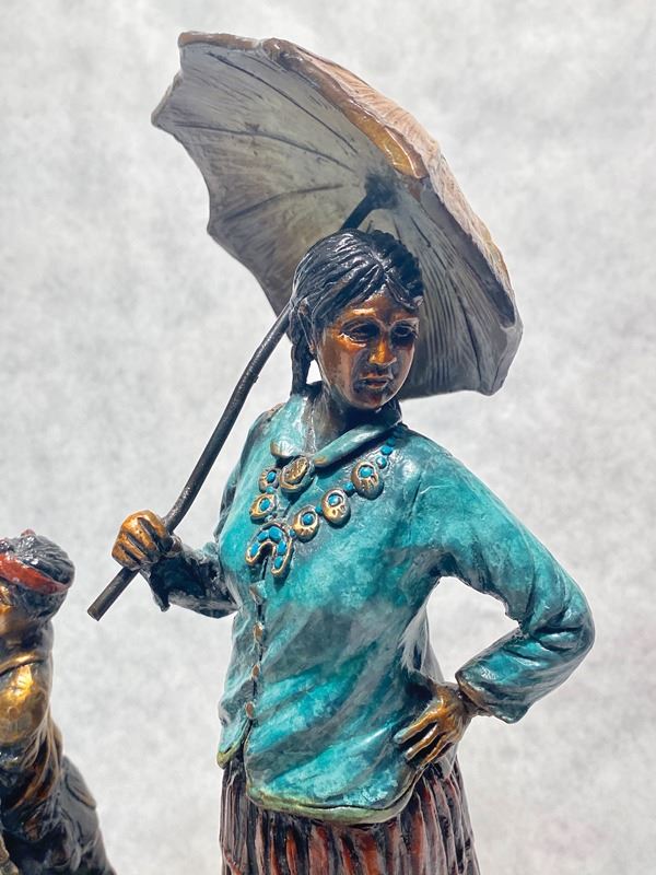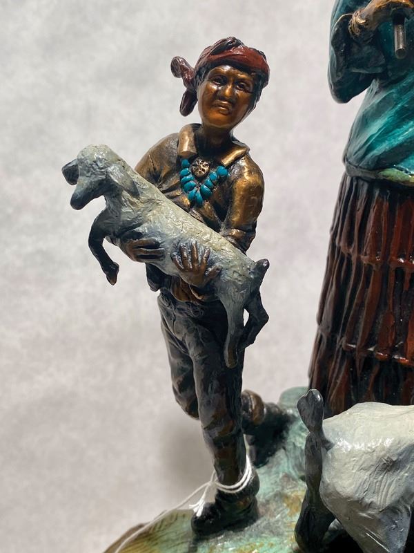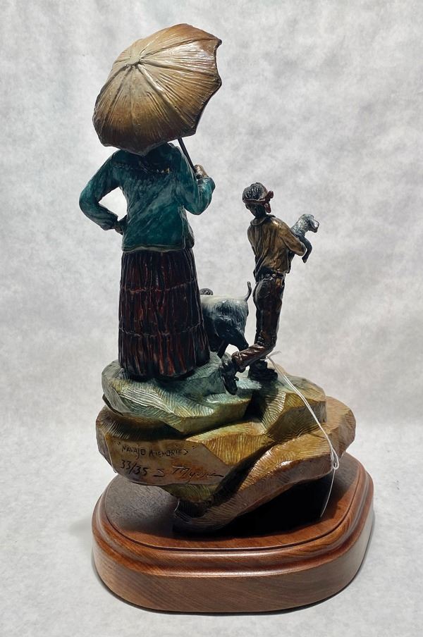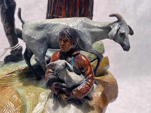 Impressive, signed, limited edition (#33/35) color patinated bronze sculpture "Navajo Memories" depicting a Navajo mother with umbrella, her son and daughter below, both holding baby sheep/goats. Excellent condition.