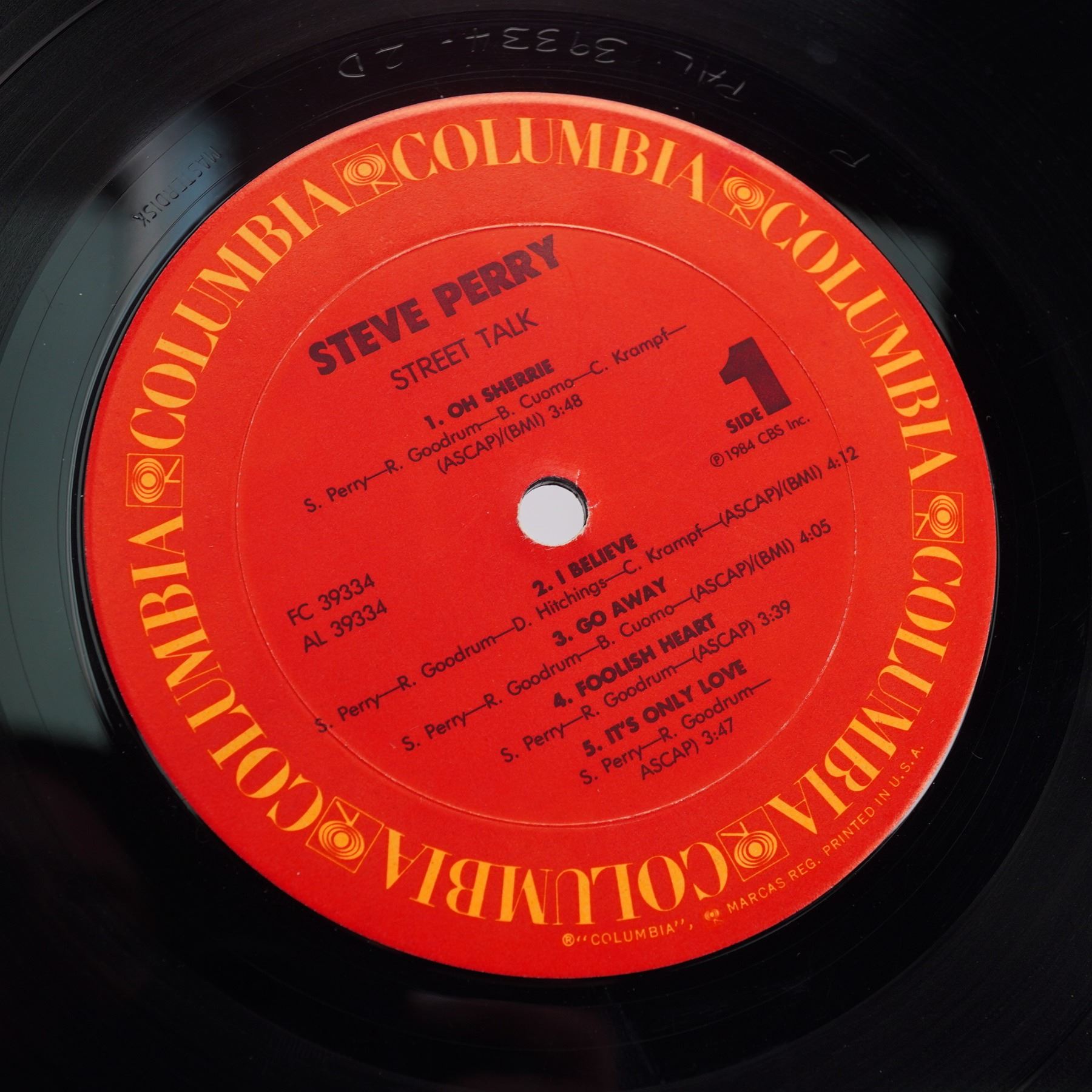 Original 1984 LP Street Talk by Steve Perry, released on Columbia Records. This solo debut from the Journey frontman includes the hit single Oh Sherrie along with Foolish Heart, She's Mine, and Strung Out. The album showcases Perry's signature vocals and songwriting outside his work with Journey. Catalog number FC 39334. Includes the original printed jacket with photo and track credits on back.