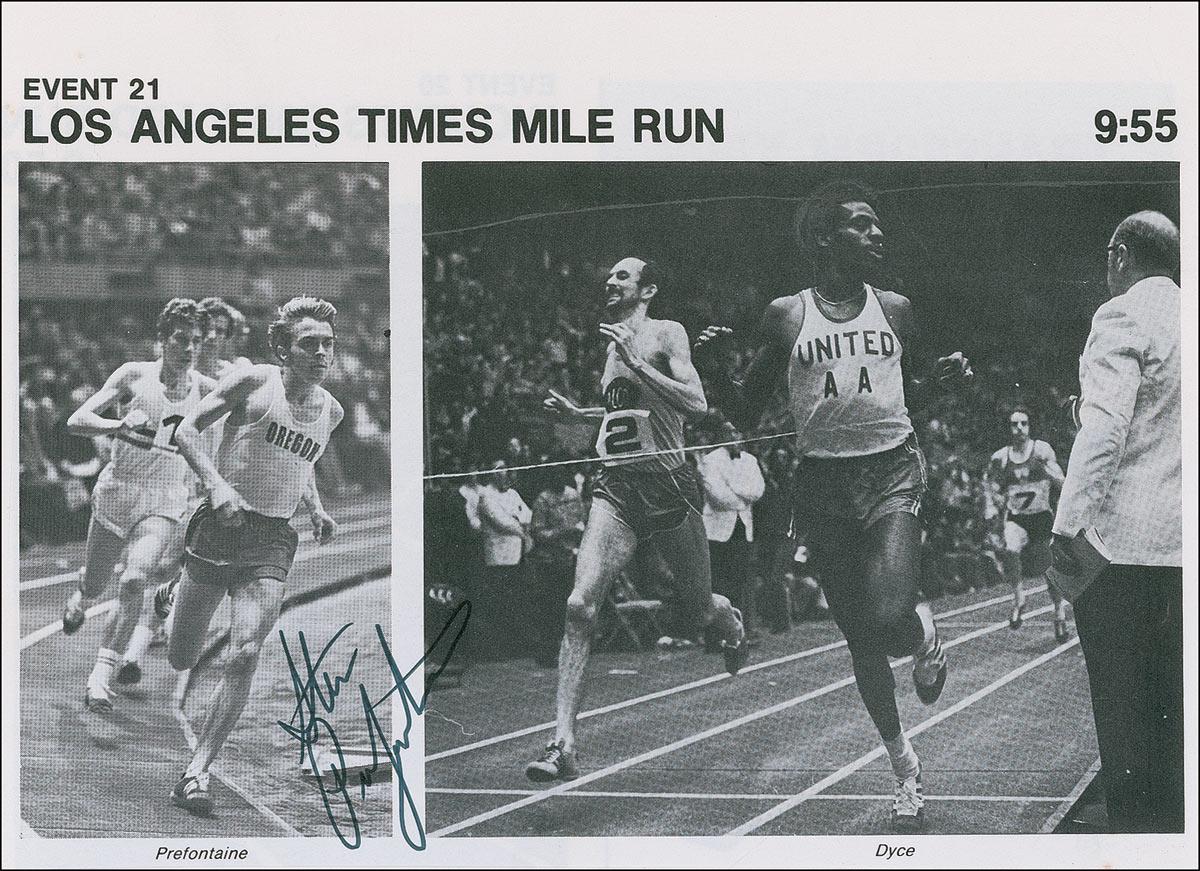 Promising American long-distance runner (1951–1975) who was killed in an auto accident at the age of 24. Vintage 7.75 x 5.5 magazine photo clipped from a publication, signed in black felt tip next to his image. In fine condition, with a few creases, spots of soiling, and trimmed edges.