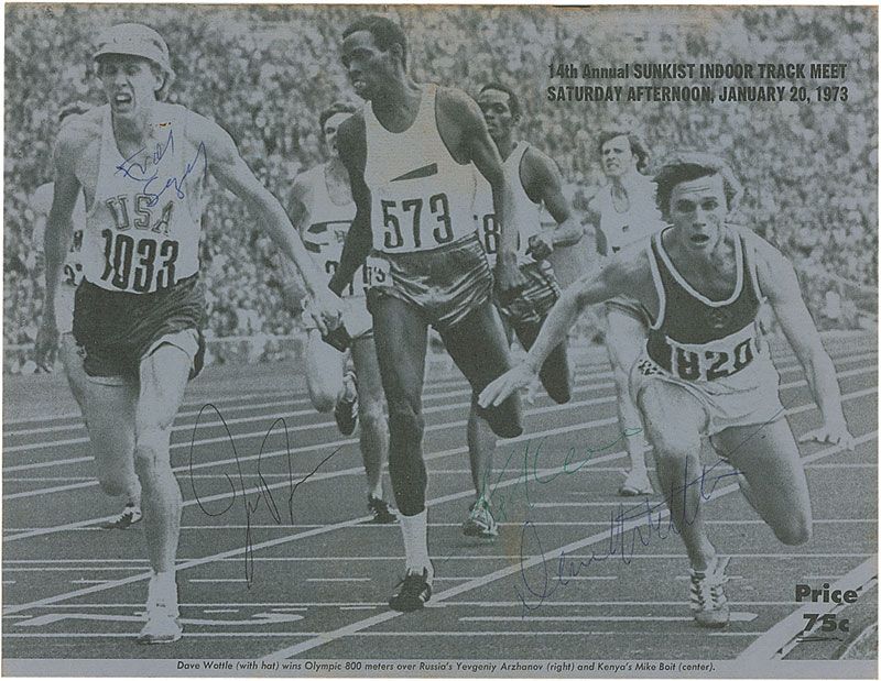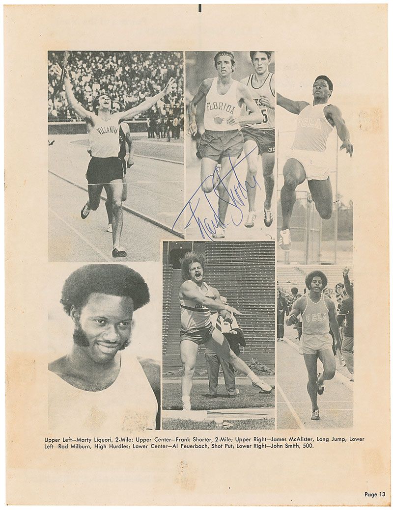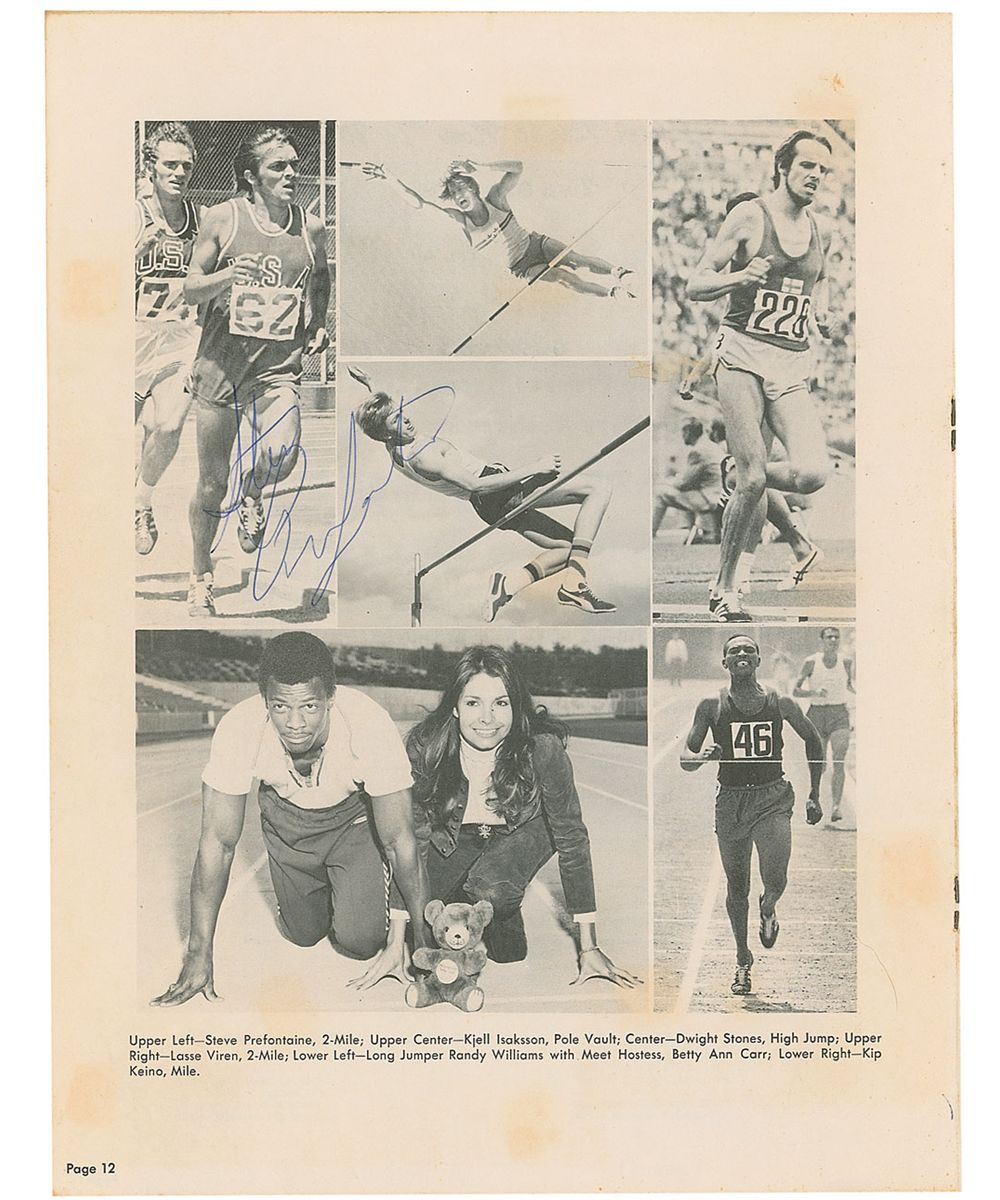 Promising American long-distance runner (1951–1975) who was killed in an auto accident at the age of 24. Program from the 14th Annual Sunkist Indoor Track Meet, held on January 20, 1973, 8.5 x 11, 22 pages. Signed inside in blue ballpoint next to his image by Steve Prefontaine and signed on the opposite page by Frank Shorter. Program is also signed on the front and back covers by six others. In very good to fine condition, with ballpoint notations to event pages indicating winners and times, toning to inside pages from scattered news clippings, light soiling, contrast to signatures on the front cover, and expected light handling wear.