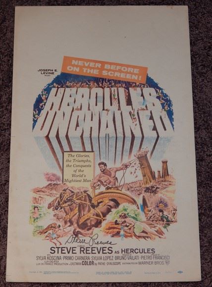 This is an original 14x22 movie poster for the film "Hercules Unchained" signed by lead actor Steve Reeves. This item comes with a Certificate of Authenticity guaranteed for the life of the piece