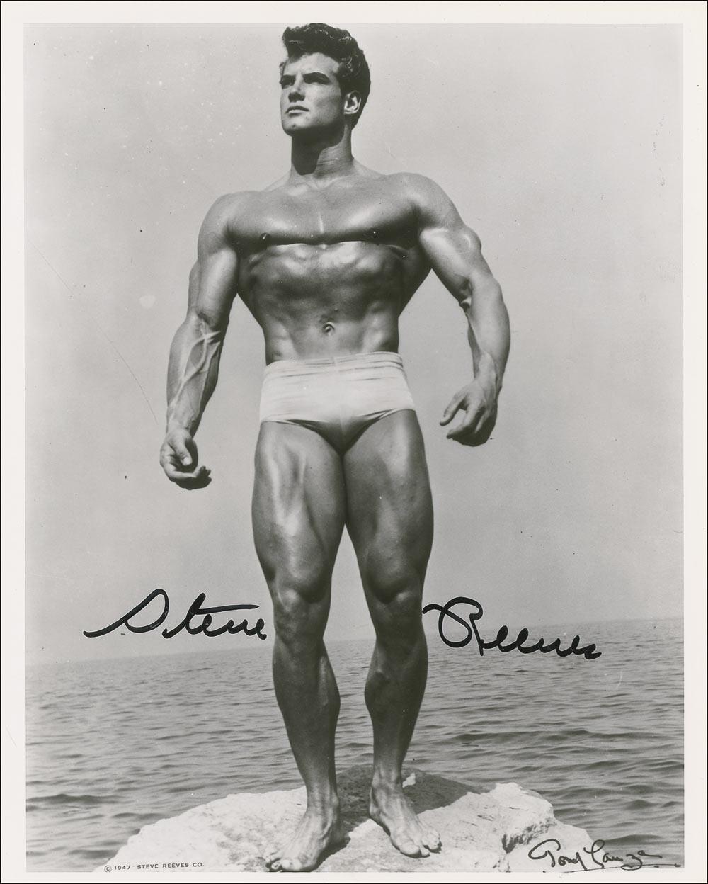 Glossy 8 x 10 photo of the well-chiseled actor posing atop a rock at the water’s edge, signed in blue felt tip. In very fine condition.