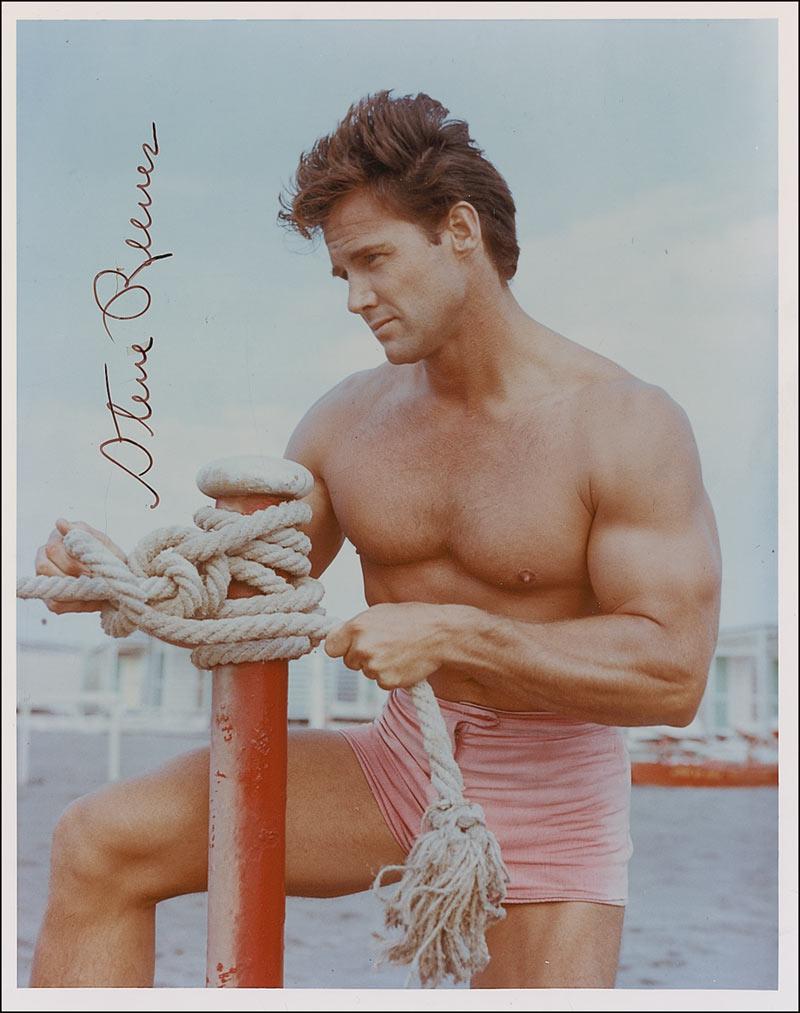 Color glossy 8 x 10 photo of the bare-chested actor working on a thick rope knot, signed vertically in black felt tip. In fine condition.