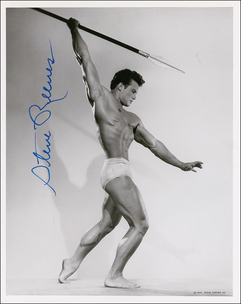 Two glossy 8 x 10 photos, one of the scantily-clad actor brandishing a spear, signed vertically in blue felt tip; and a color photo of Reeves in a jacket and tie, signed vertically in black felt tip. In fine condition.