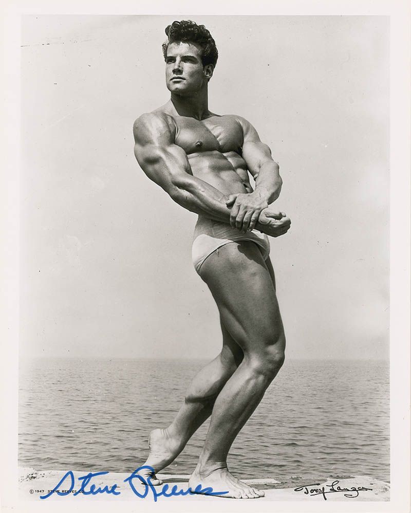 Glossy 8 x 10 photo of Reeves flexing his muscles by the ocean, signed in blue felt tip. In fine condition.