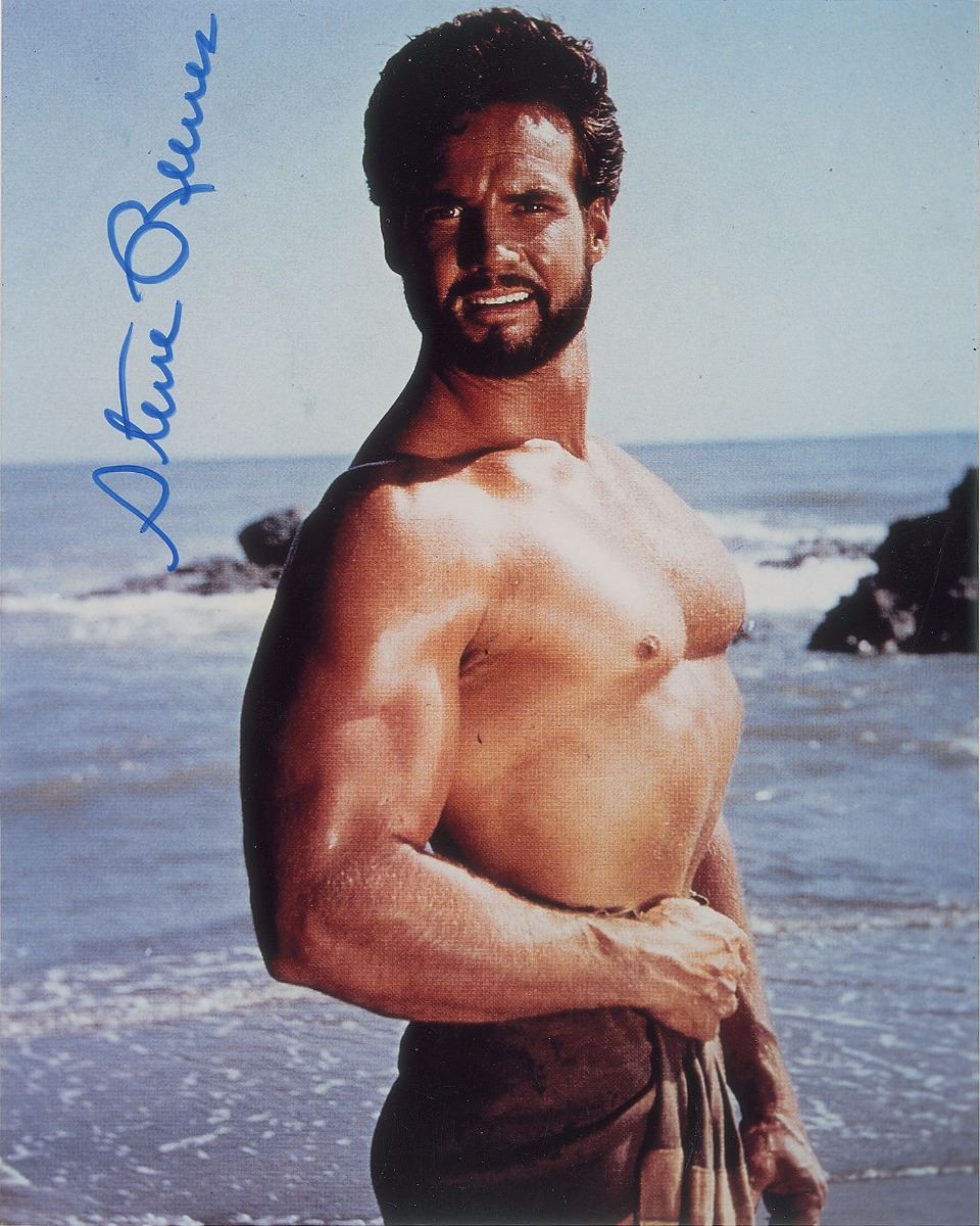 Appealing color glossy 8 x 10 half-length photo of the brawny Reeves posing on a shoreline, signed in blue felt tip. In very fine condition.