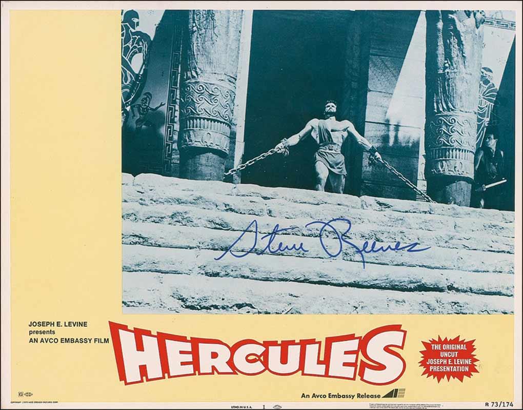 Color lobby card for the 1973 release of Hercules, signed in blue felt tip. In fine condition.