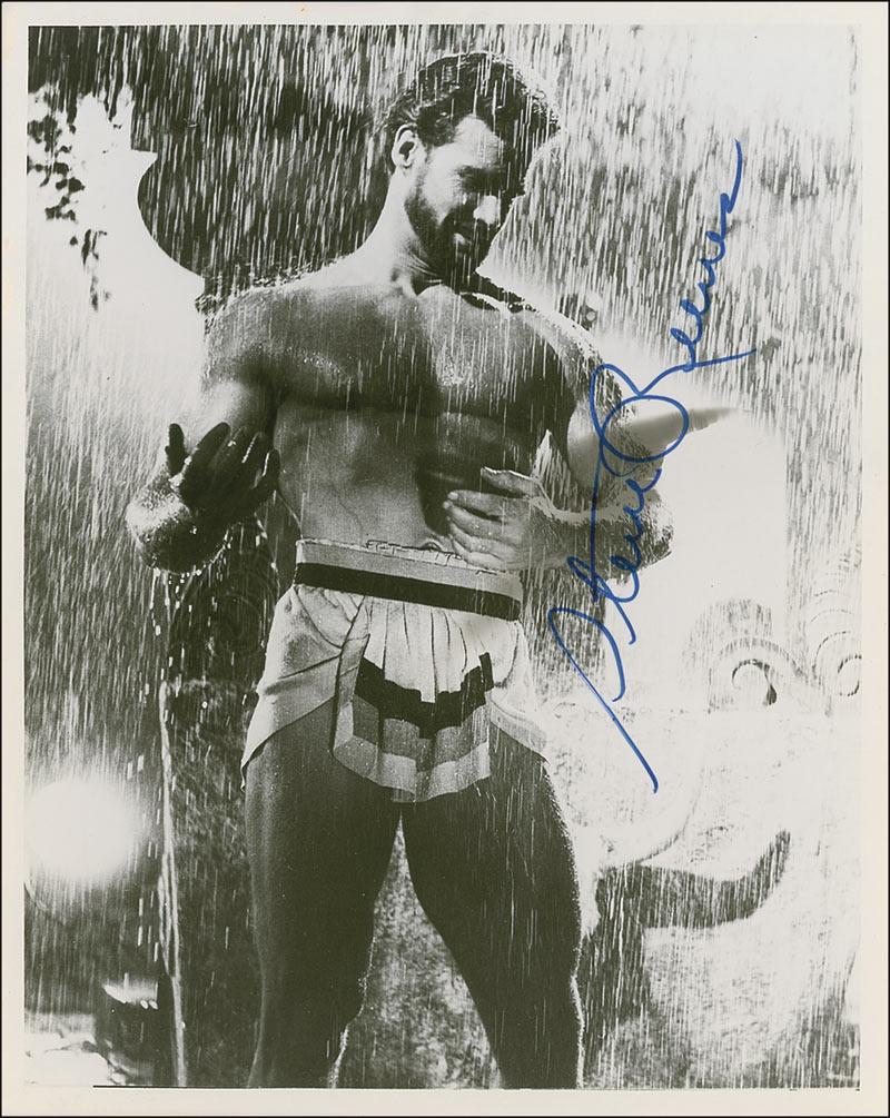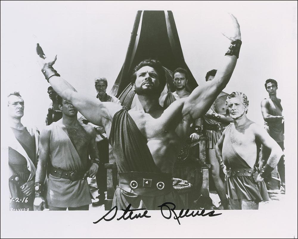Two signed glossy photos of Reeves as Hercules, one 8 x 10 and one 10 x 8, signed in blue and black felt tip respectively. In fine condition.