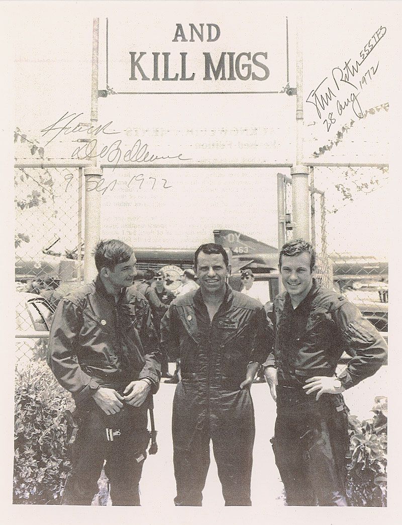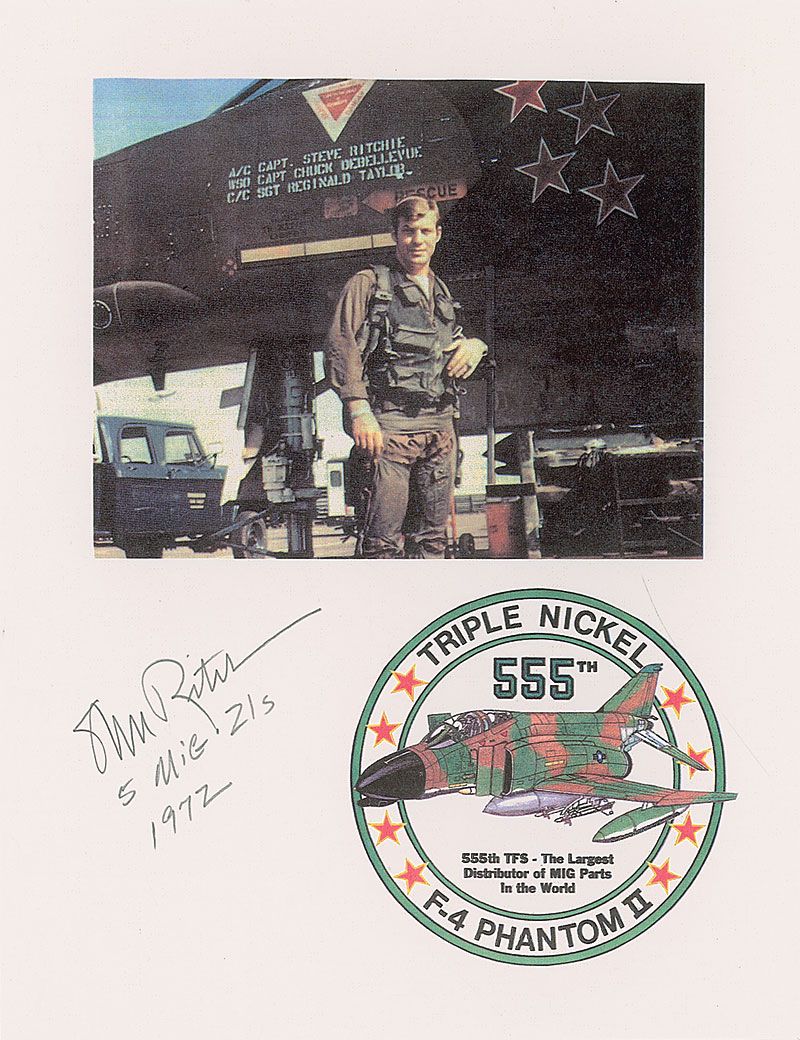 Two cardstock laserprint 8.5 x 11 photos: a color photo of Steve Ritchie in front of his fighter, signed in pencil, “Steve Ritchie 5 MiG 21s, 1972”; and one of Ritchie and Chuck DeBellevue outside their base, signed in pencil by both. In fine condition.