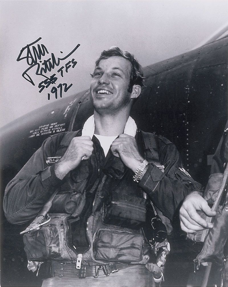 Fighter pilot who shot down five MiGs to become the only USAF ace of the Vietnam War (born 1942). Scarce satin-finish 8 x 10 photo of Ritchie outside of his plane, signed in black felt tip, “Steve Ritchie, 555 TFS, 1972.” In very fine condition.