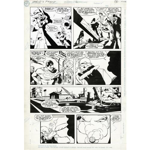 <B>Steve Rude and Karl Kesel - World's Finest #2 page 9 Original Art (DC, 1990).</B></I> Steve Rude's classical style was a perfect fit for this nostalgic prestige series that retconned the first meeting between Superman and Batman. This lovely page features Superman the way he should always look -- young, handsome, and heroic. Evil genius Lex Luthor also appears. The first panel is a stat, but the original art is underneath, and overall the art is in Excellent condition. The image area measures 10" x 15".