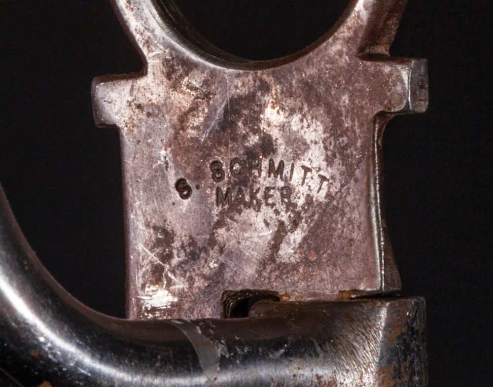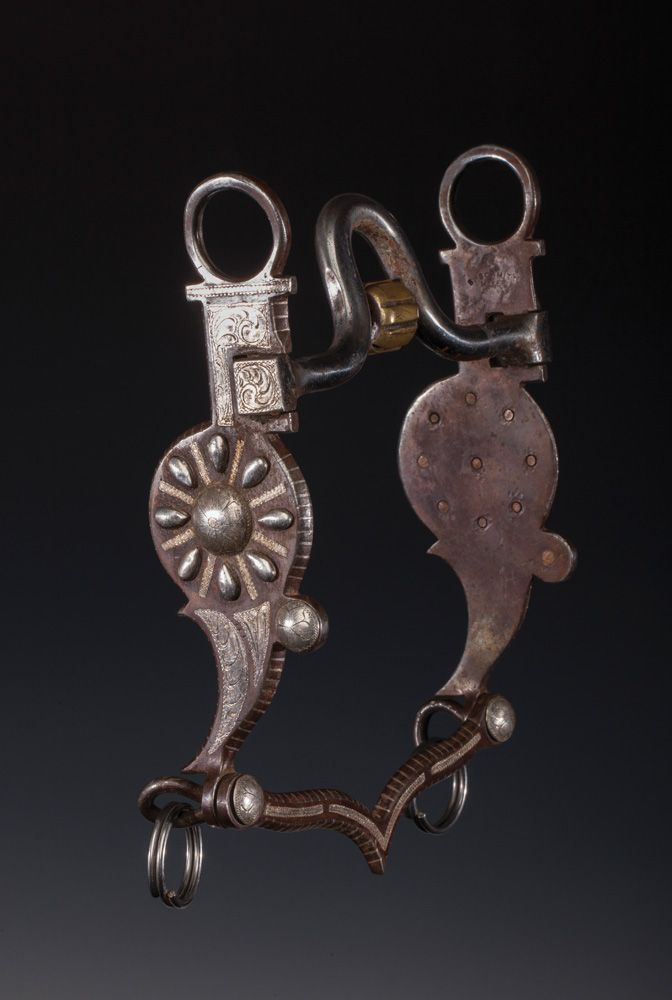 Steve Schmitt Bit. Loose cheek, half-breed with roller, spoke and tear drop inlay and overlay. "V" inlaid slobber bar. Shows use and surface rust. PROVENANCE: Dick Powell Collection, Casa Grande, Arizona
