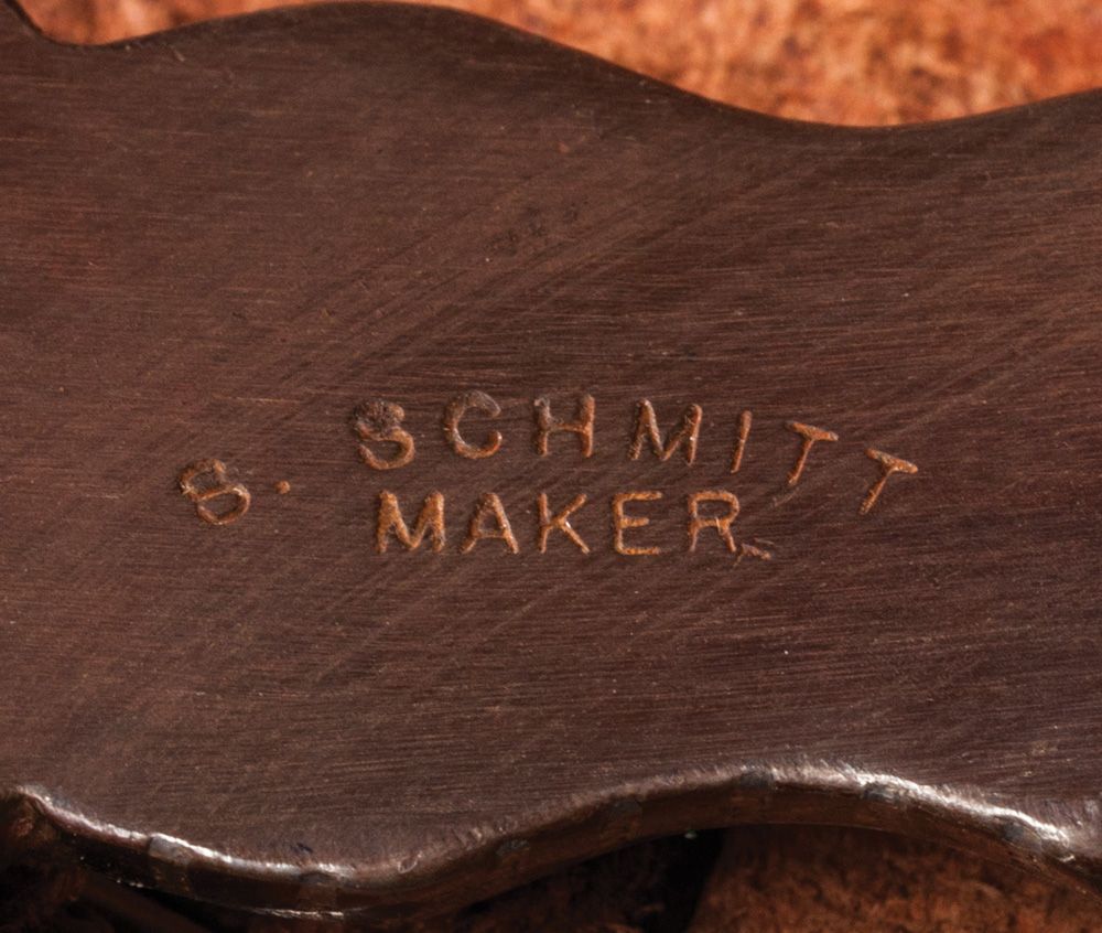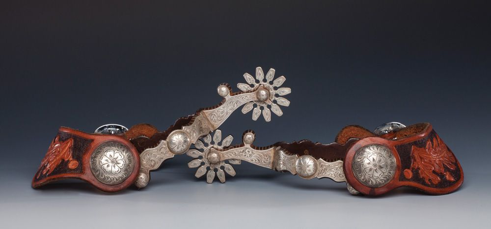 Steve Schmitt Overlaid Spurs. S. Schmitt maker-marked full silver overlaid spurs with split heelband and central floral dome concho. Showy and stylized spade pattern 12-point overlaid rowels. Two-piece oak leaf and acorn carved leather straps with engraved 2" domed conchos. Unused condition, circa 1990s. Steve made these spurs for Dick when they were close friends and neighbors in Casa Grande during the late 1990s. PROVENANCE: Dick Powell Collection, Casa Grande, Arizona