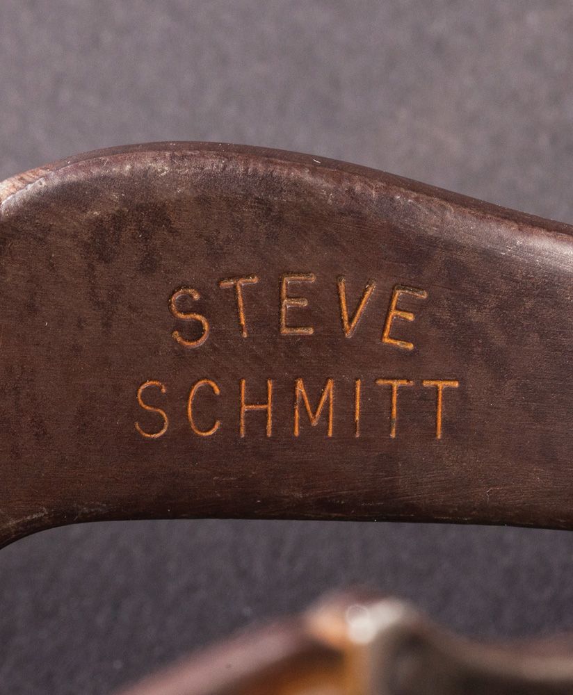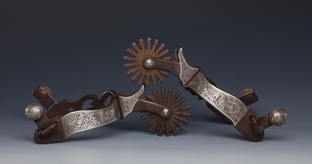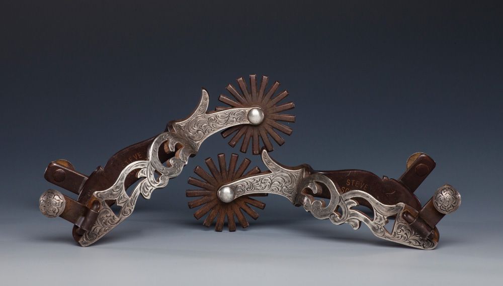 Steve Schmitt Overlaid Spurs. Artistically engraved STEVE SCHMITT maker-marked, fully mounted silver overlaid spurs with cut-out scroll pattern bands, swinging silver buttons, 2", 20-point rowels. unused condition, circa 1990s. PROVENANCE: Dick Powell Collection, Casa Grande, Arizona