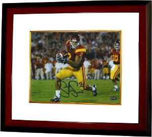 Steve Smith was one of the top two wide receivers by yardage at the University of Southern California. He was on the Maxwell Award 2006 watch list for the best player in college football and was named to the 2006 All Pac-10 team First Team and to the 2006 All Pac-10 Second Team by rivals.com. Smith was named honorable mention on the SI.com All-American team and First-team All-American by CBS Sportsline. Smith was voted team MVP in 2006 by teammates of his 4th ranked Trojans team. Smith caught three touchdown passes from Heisman Trophy winner Matt Leinart in USC's 55-19 national championship/Orange Bowl victory over Oklahoma. Steve Smith has hand autographed this USC Trojans 8x10 Photo. Custom White Mat and Wood Frame as shown. GTSM Hologram and Certificate of Authenticity from Athlon Sports.