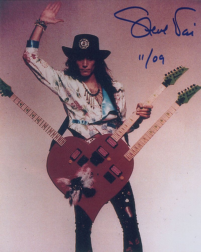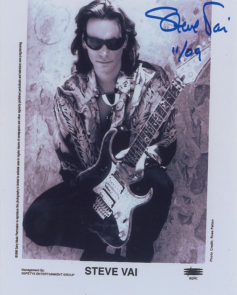 Two glossy 8 x 10 photos, one color, each featuring the guitar master with the instrument of his success, and each signed in blue felt tip, “Steve Vai, 11/09.” In fine condition.